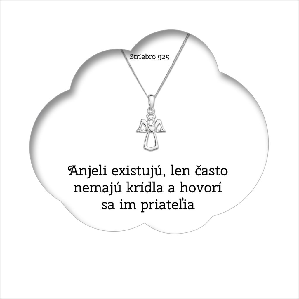Vybrali sme pre vás limitovanú edíciu darčekovo zabalených šperkov v obláčikovej obálke ako z neba znesené. Nemusíte už nič vymýšľať. Šperk aj kartička s prianím sú tematicky zladené a pripravené ihneď na odovzdanie.Darčekový set obsahuje strieborný náhrdelník anjel so srdiečkom. Je zavesený na darčekovej karte s nádherným prianím „Anjeli existujú, len často nemajú krídla a hovorí sa im priatelia“. Krásny nežný darček pre kamarátku, ktorá je vašim strážnym anjelom.