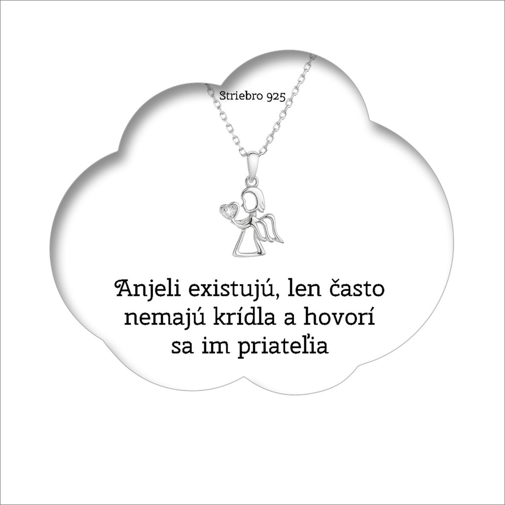 Vybrali sme pre vás limitovanú edíciu darčekovo zabalených šperkov v obláčikovej obálke ako z neba znesené. Nemusíte už nič vymýšľať. Šperk aj kartička s prianím sú tematicky zladené a pripravené ihneď na odovzdanie.Darčekový set obsahuje strieborný náhrdelník anjel držiaci srdiečko zo zirkónu. Je zavesený na darčekovej karte s nádherným prianím „Anjeli existujú, len často nemajú krídla a hovorí sa im priatelia“. Krásny nežný darček pre kamarátku, ktorá je vašim strážnym anjelom.