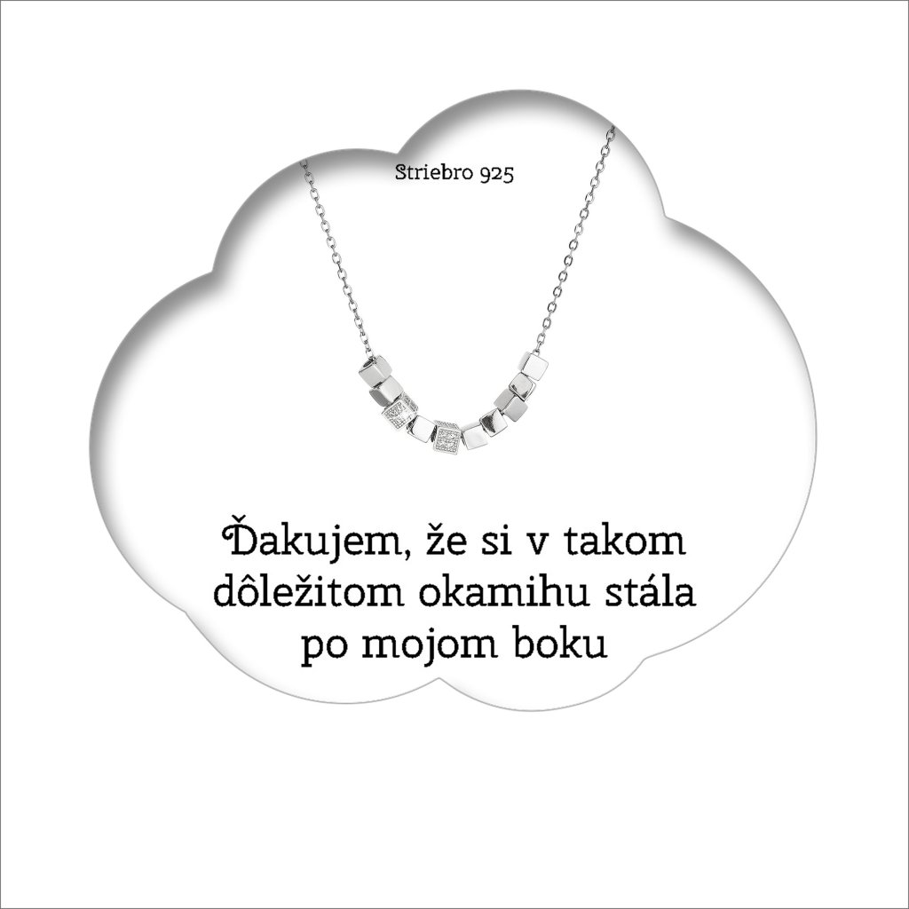 Strieborný náhrdelník je zdobený drobnými kockami - niekoľko z nich je posiate malými zirkónmi v bielej farbe. Na náhrdelník bolo použité striebro rýdzosti 925/1000, ktorého povrch prešiel úpravou ródiom. Rhodium šperk ochráni proti sčernaniu, zožltnutiu alebo poškriabaniu. Neobsahuje nikel , a tak ho môžu bez obáv nosiť aj alergici.