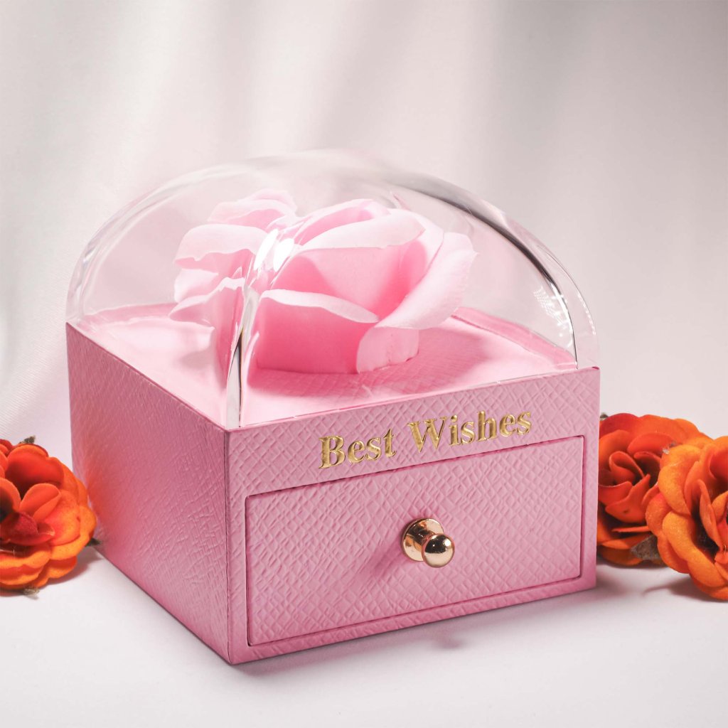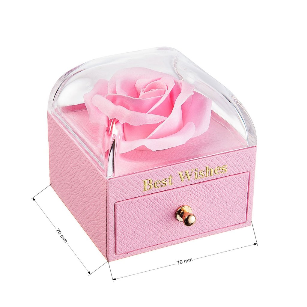 Krabička je ružová s priehľadným krytom, ktorý chráni kvietok. Je ideálnou voľbou pre darovanie pri slávnostnej príležitosti ako je Valentín, výročie, zásnuby. Krabička obsahuje praktickú priehradku určenú na uloženie šperkov – napríklad prstienku alebo náušníc.