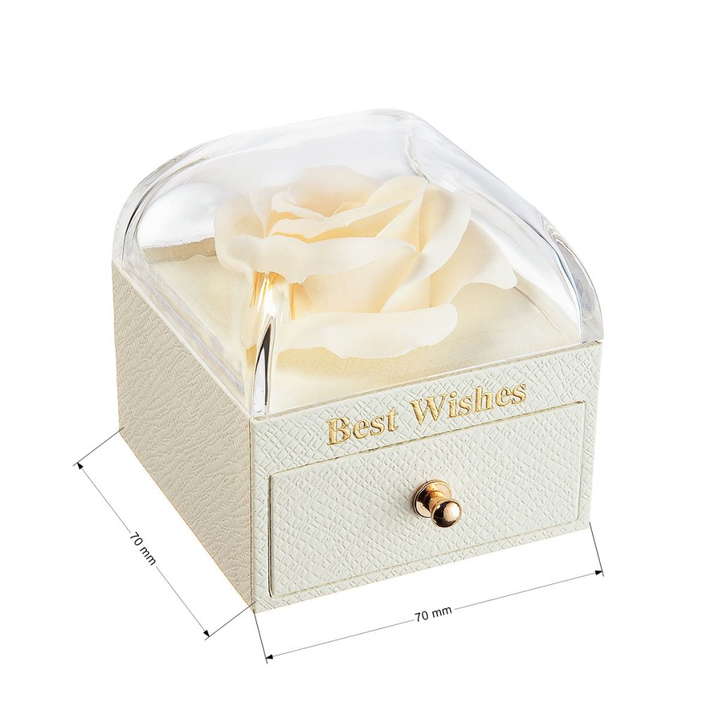 Krabička je biela s priehľadným krytom, ktorý chráni kvietok. Je ideálnou voľbou pre darovanie pri slávnostnej príležitosti ako je Valentín, výročie, zásnuby. Krabička obsahuje praktickú priehradku určenú na uloženie šperkov – napríklad prstienku alebo náušníc.