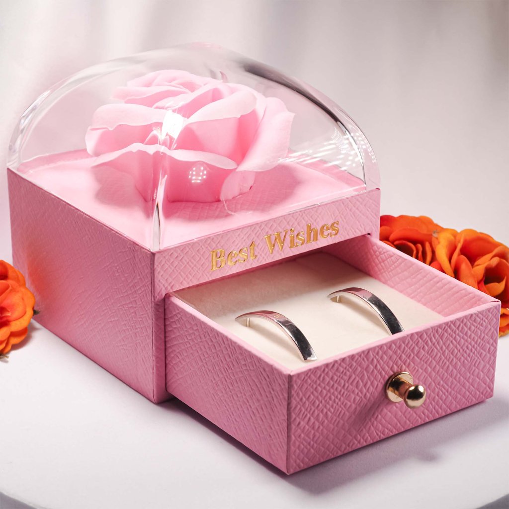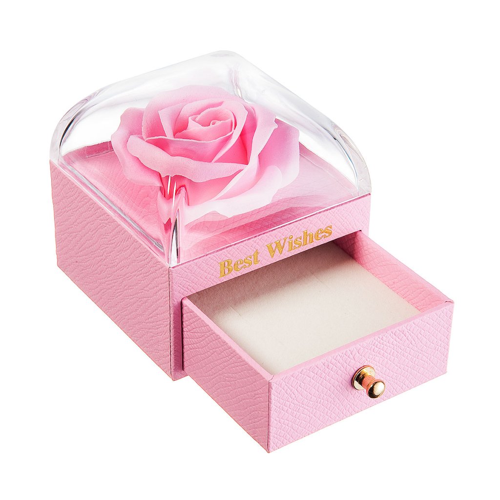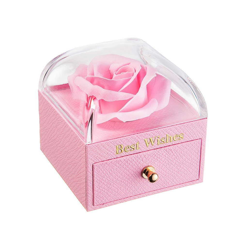 Krabička je ružová s priehľadným krytom, ktorý chráni kvietok. Je ideálnou voľbou pre darovanie pri slávnostnej príležitosti ako je Valentín, výročie, zásnuby. Krabička obsahuje praktickú priehradku určenú na uloženie šperkov – napríklad prstienku alebo náušníc.