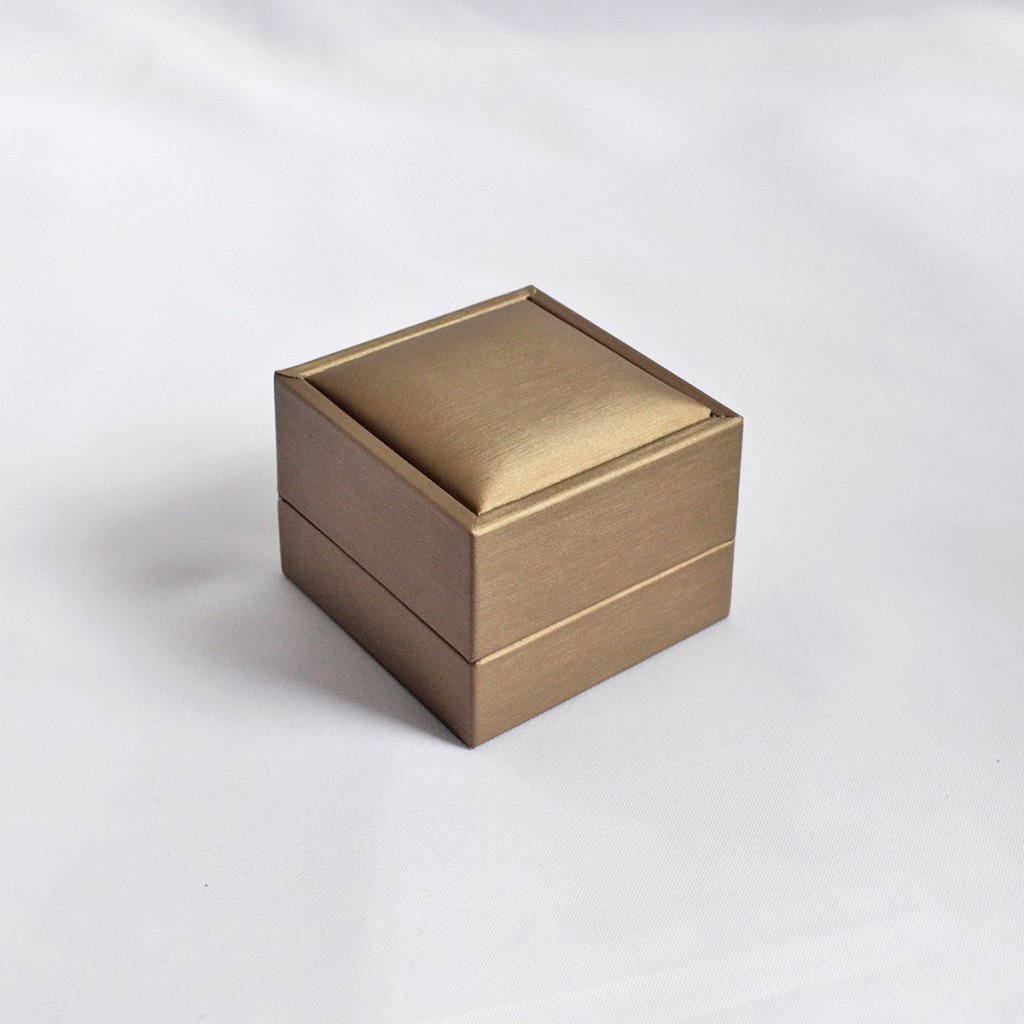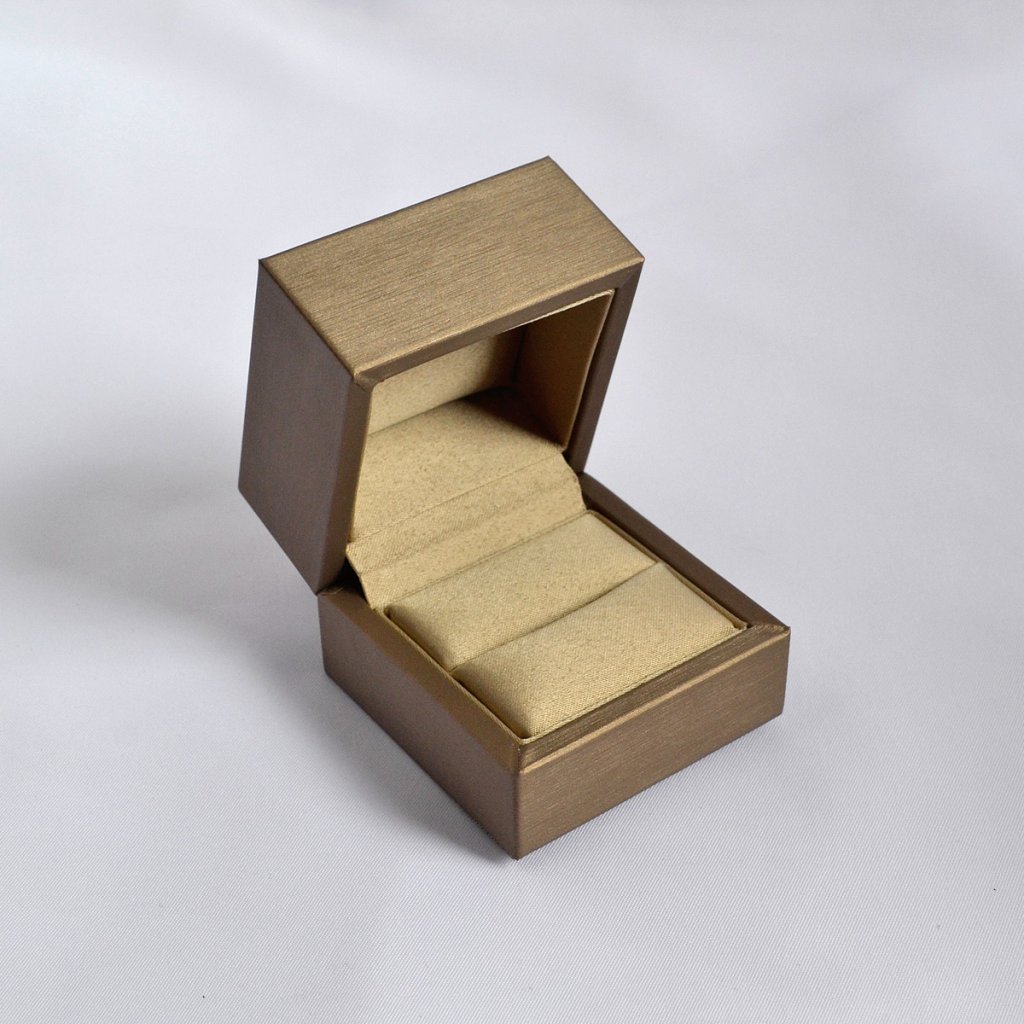 Štýlová otváracia krabička II. akosti, ideálna na uloženie a odovzdanie prstienka. Vnútorná časť je vybavená praktickým lôžkom s výrezom na bezpečné uchytenie šperku. Krabička je ladená do tmavo bronzového odtieňa a jej jemne štruktúrovaný ryhovaný povrch pôsobí elegantne a luxusne.