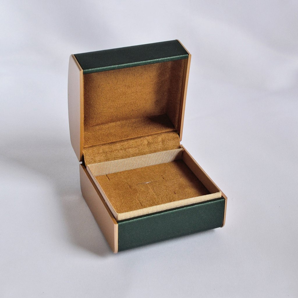 Boky krabičky sú ladené do bronzovej farby, zatiaľ čo prednú časť zdobí elegantný tmavo zelený odtieň, ktorý pôsobí pokojne, luxusne a nadčasovo. Vnútorná časť krabičky je bronzová a obsahuje praktické výrezy, ktoré umožňujú bezpečné a prehľadné uloženie rôznych typov šperkov - náušníc, náhrdelníka, prsteňa, náramku alebo celej súpravy.