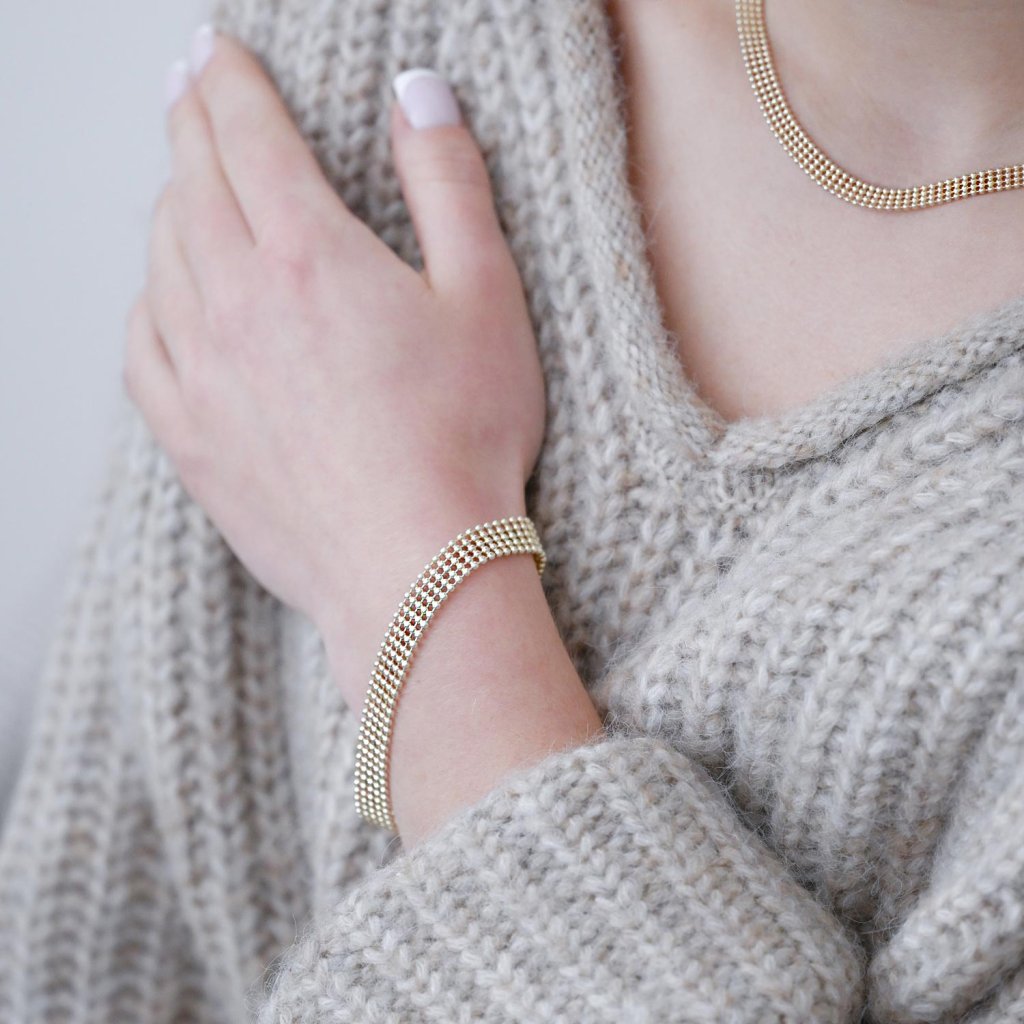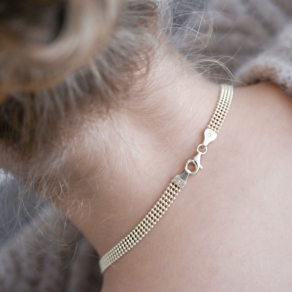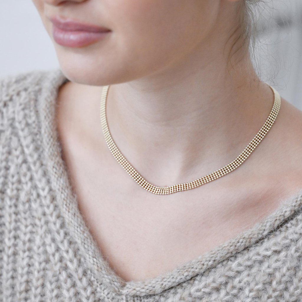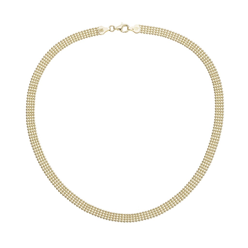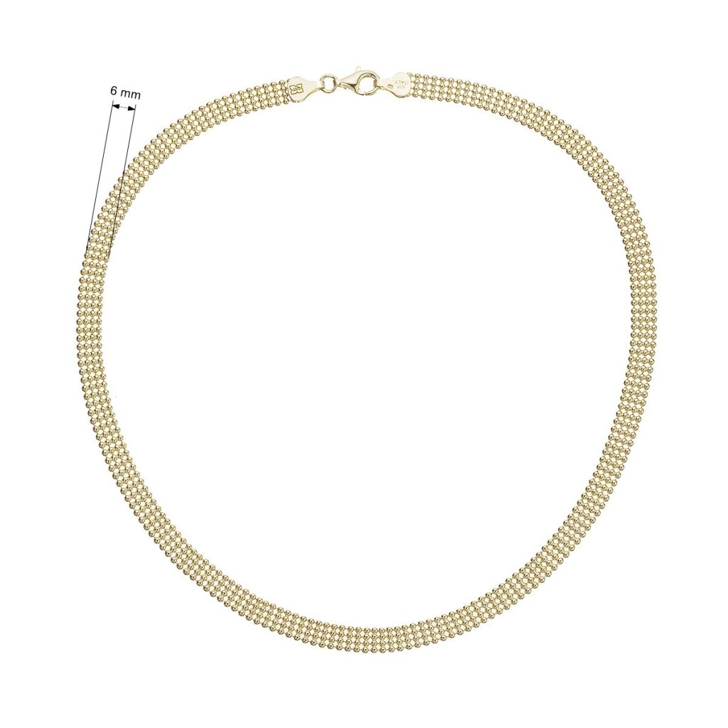 Elegantný jemný náhrdelník zložený zo štyroch radov drobných, dokonale symetrických guličiek pôsobí ako zhmotnená ľahkosť a pôvab. Plochý tvar z pozláteného striebra pôsobí nežným, ale napriek tomu výrazným dojmom, ktorý prirodzene podčiarkne vašu ženskosť.