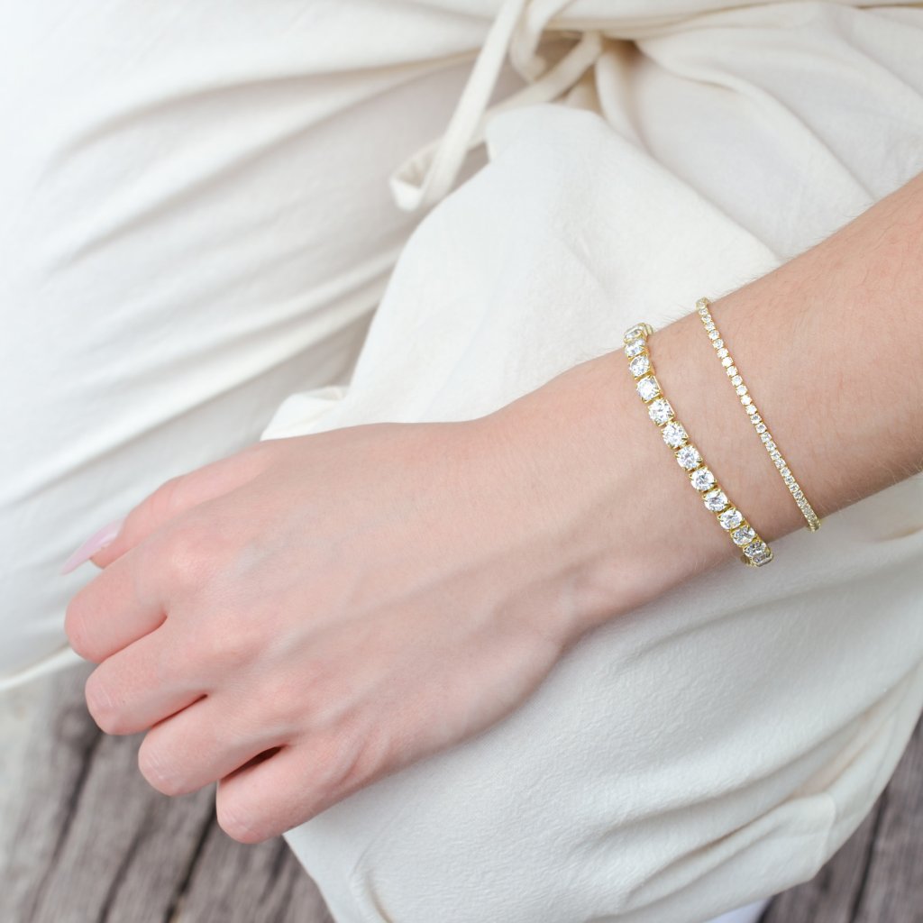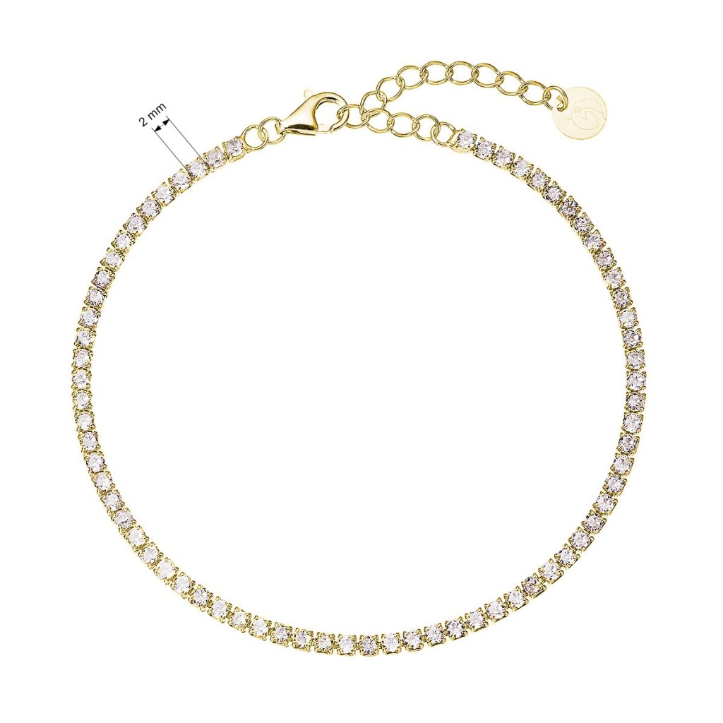 Elegantný tenisový náramok z pozláteného striebra, osadený radom precízne brúsených zirkónov, ktoré krásne odrážajú svetlo pri každom pohybe . Jeho jemný, ale výrazný dizajn z neho robí luxusný doplnok na každú príležitosť – od bežného nosenia až po slávnostné večery. Vďaka nastaviteľnej dĺžke perfektne padne na každé zápästie. Trblietavé zirkóny o veľkosti 2 mm sú vsadené do pozláteného striebra rýdzosti 925/1000.