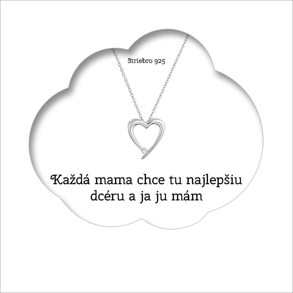 Vybrali sme pre vás limitovanú edíciu darčekovo zabalených šperkov v obláčikovej obálke ako z neba znesené . Nemusíte už nič vymýšľať. Šperk aj kartička s prianím sú tematicky zladené a pripravené ihneď na odovzdanie.Darčekový set obsahuje strieborný náhrdelník s lesklým srdiečkom ozdobený zirkónom , ktorý je zavesený na darčekovej karte s nádherným prianím „Každá mama chce tú najlepšiu dcéru a ja ju mám“. Materská láska je nekonečná a veľmi krásna. Srdce značí odvahu, statočnosť, ale hlavne vyjadruje lásku k vašej milovanej dcére.