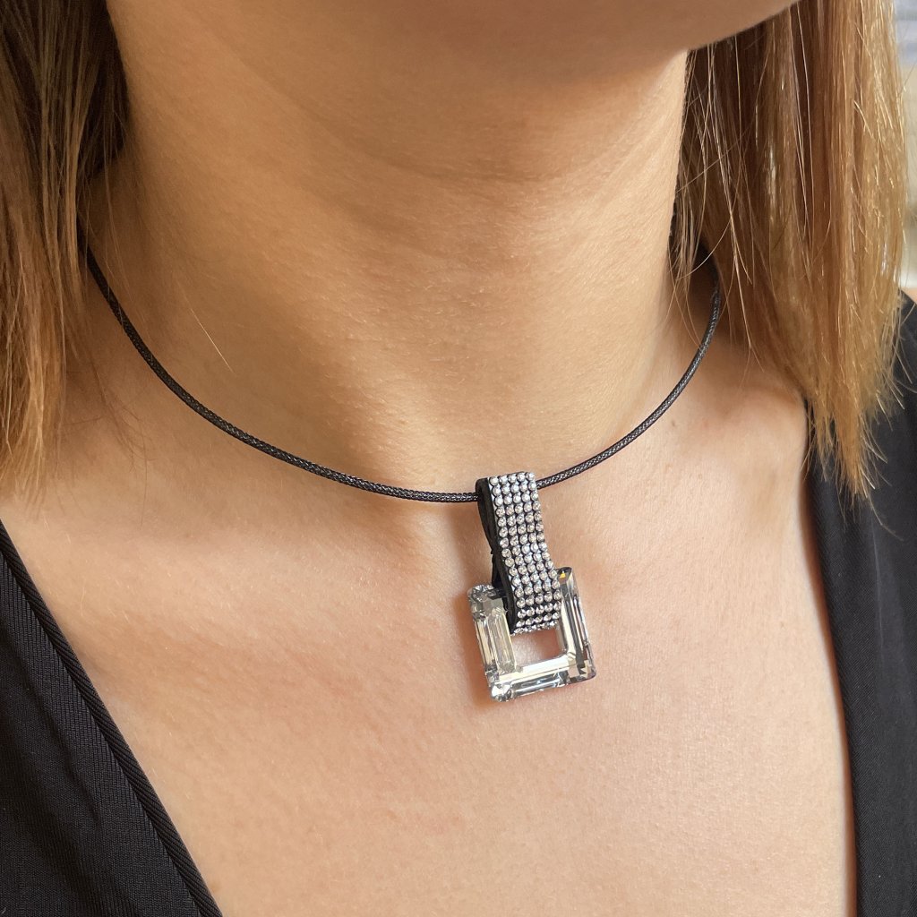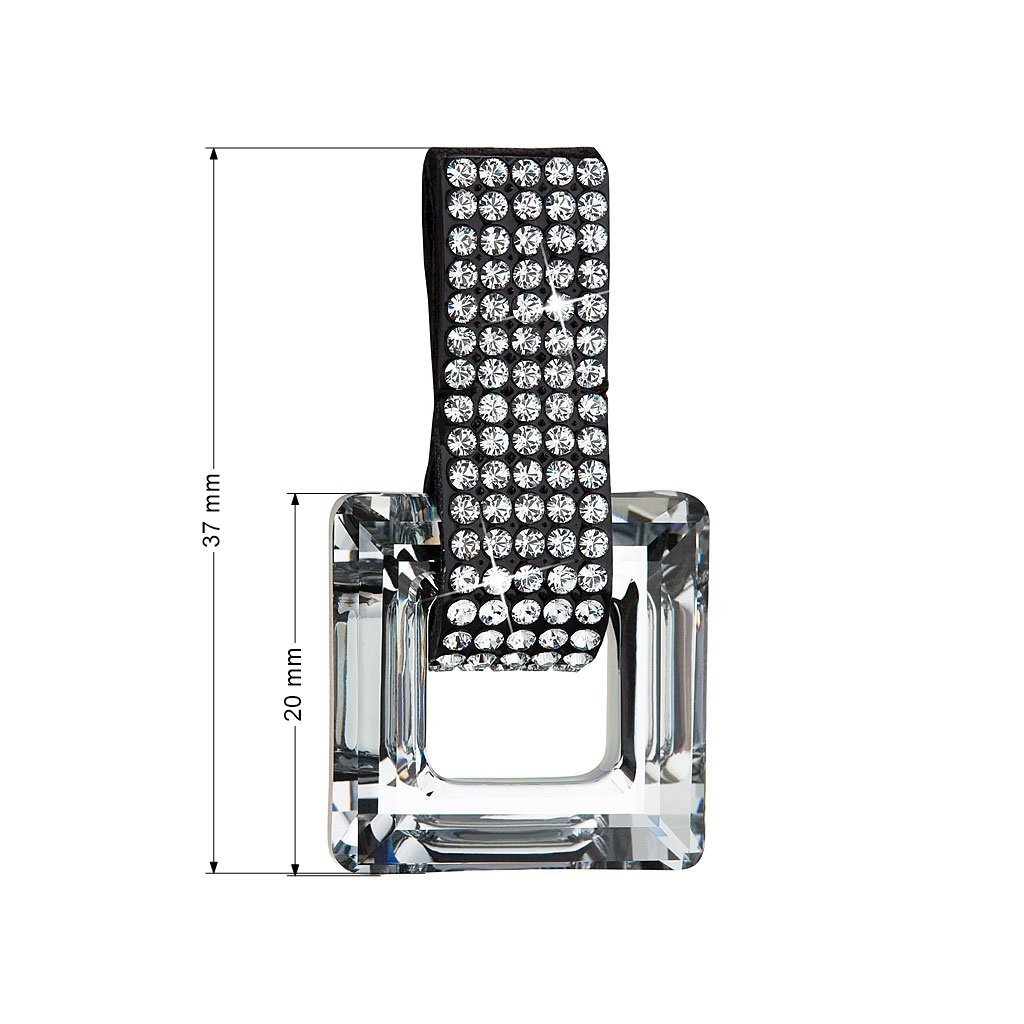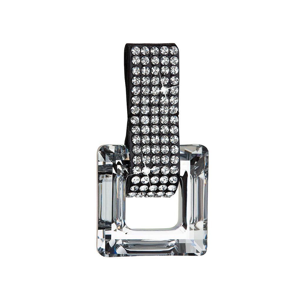 Prívesok 34129.5 zdobí veľký číry štvorec - kryštál . Kožené pútko je vysadené mnohými malými okrúhlymi bielymi kryštálmi, ktoré zjemňujú drsný kožený remienok.