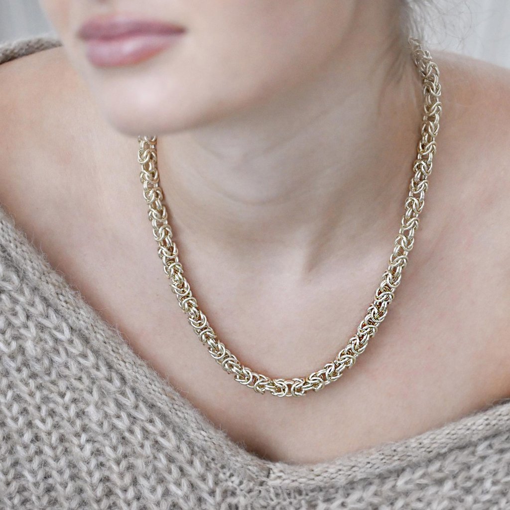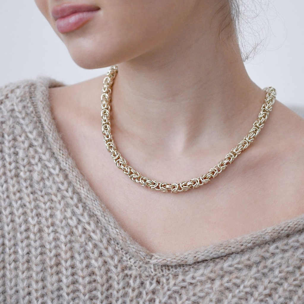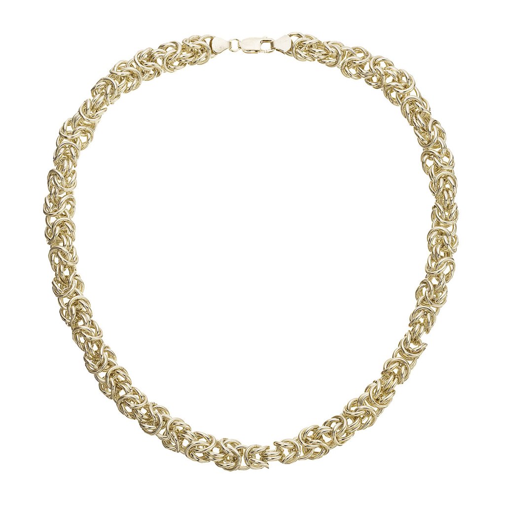 Pozlátený náhrdelník v bohato prepletenom dizajne, ktorý pripomína kráľovské reťaze starovekých civilizácií, sa stane dominantným prvkom každého outfitu. Lesklé články sa prepletajú do luxusnej štruktúry, ktorá je výrazná, ale pritom sofistikovaná.