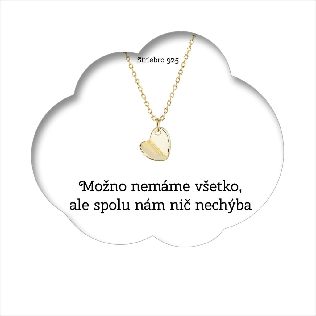 Vybrali sme pre vás limitovanú edíciu darčekovo zabalených šperkov v obláčikovej obálke ako z neba znesené. Nemusíte už nič vymýšľať. Šperk aj kartička s prianím sú tematicky zladené a pripravené ihneď na odovzdanie.Darčekový set obsahuje pozlátený strieborný náhrdelník srdca . Náhrdelník je zavesený na darčekovej karte s nádherným prianím „Možno nemáme všetko, ale spolu nám nechýba nič“. Srdce značí odvahu, statočnosť, ale hlavne vyjadruje lásku k vami milovanému človeku.