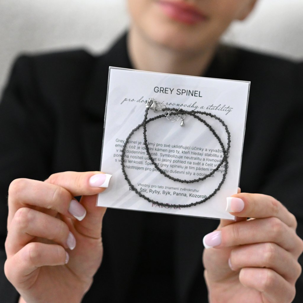 Predstavte si náhrdelník, ktorý nie je len krásny, ale má aj svoj príbeh. Drobné fazetované kamienky grey spinelu sa trblietajú ako hviezdy na nočnej oblohe a vytvárajú pôsobivú harmóniu, ktorá priťahuje pohľady. Tento výnimočný šperk nie je len módnym doplnkom – podľa starých tradícií kameň grey spinel posilňuje sebadôveru a vnáša do života stabilitu. Je to ako nosiť svoj vlastný talizman pre šťastné dni . Každý kamienok je starostlivo vybrúsený, aby vynikla jeho prirodzená krása. Spoľahlivé oceľové zapínanie ochráni váš šperk pred nechcenou stratou.