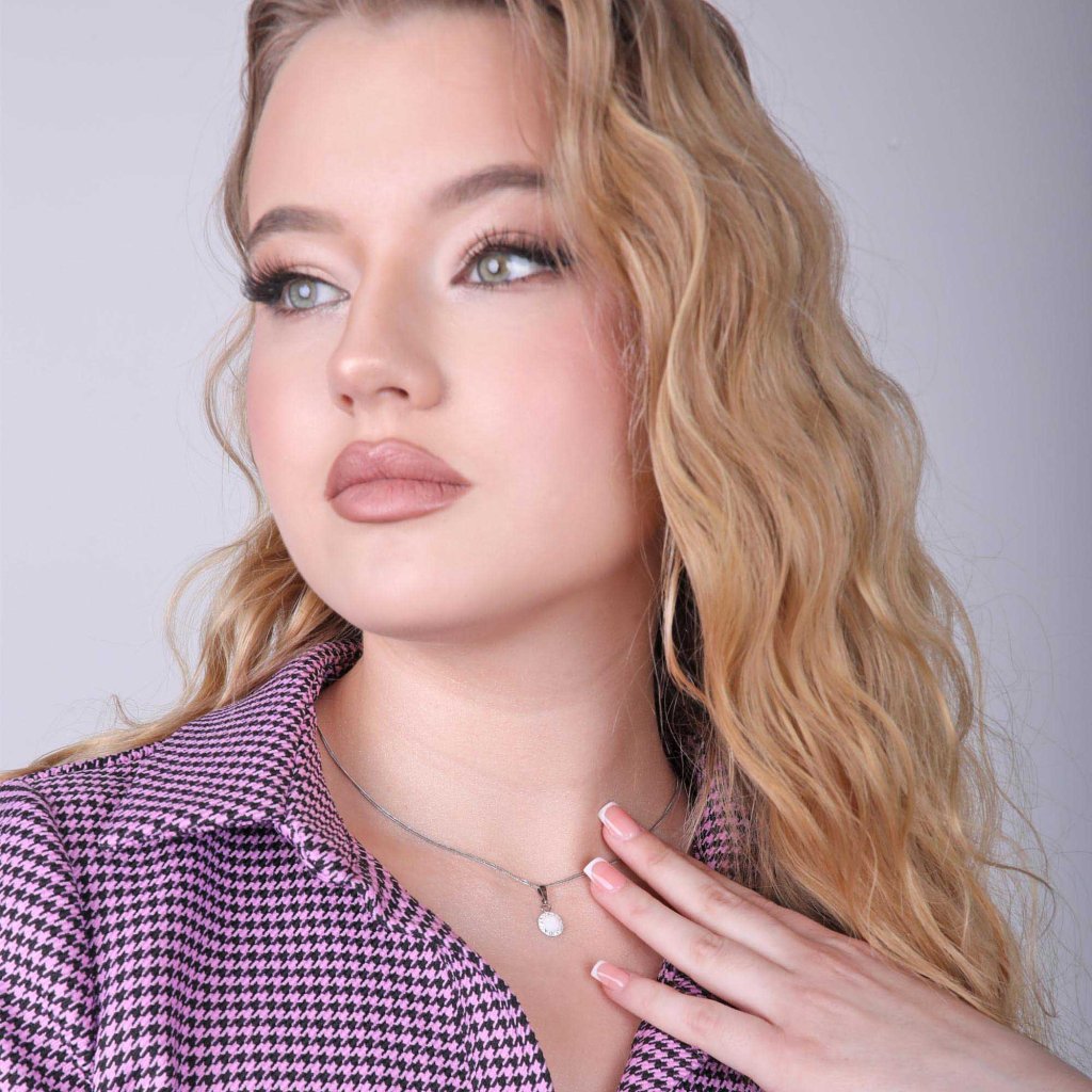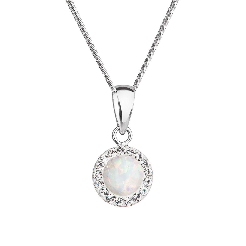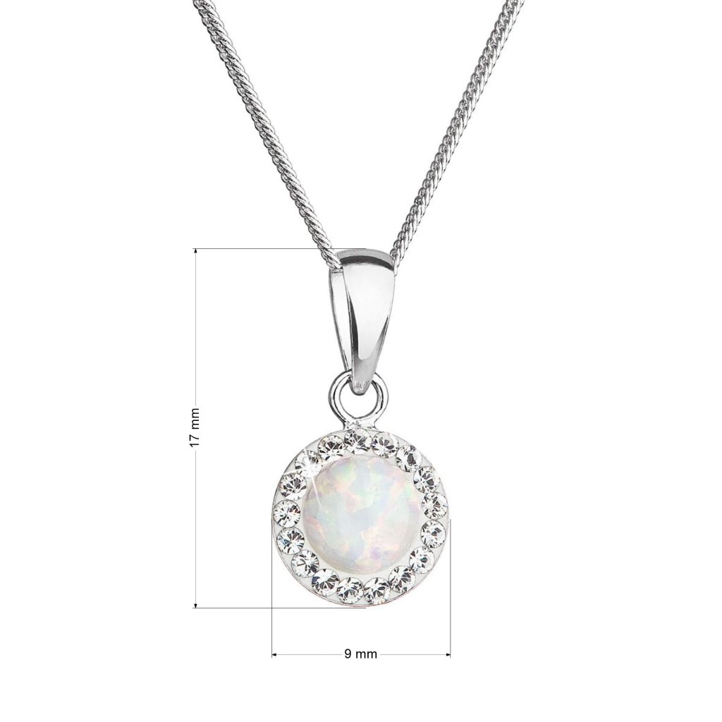 Náhrdelník obsahuje retiazku s okrúhlym príveskom. Šperk je vyrobený zo striebra rýdzosti 925/1000, ktoré prešlo povrchovou úpravou ródiom. Ródium chráni šperk proti sčerneniu, zožltnutiu i poškriabaniu. Prívesok je zdobený bielym syntetickým opálom , ktorý je navyše olemovaný malými trblietavými Preciosa kryštálmi v bielej farbe. Môžete si k nemu vybrať aj rovnaké náušnice so zapínaním na puzetu alebo skrutku. Keďže šperk neobsahuje žiadny prídavok niklu , môžu ho bez obáv nosiť aj alergici.