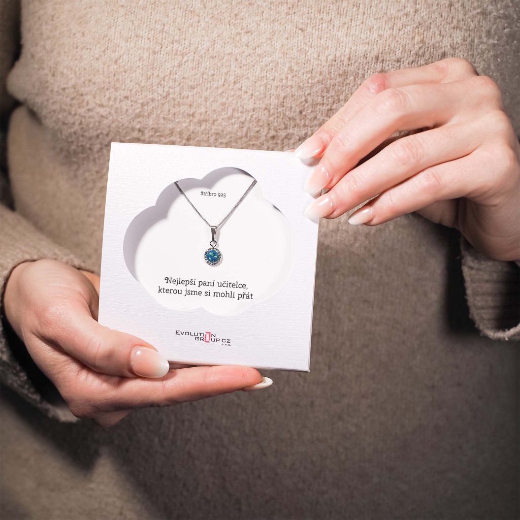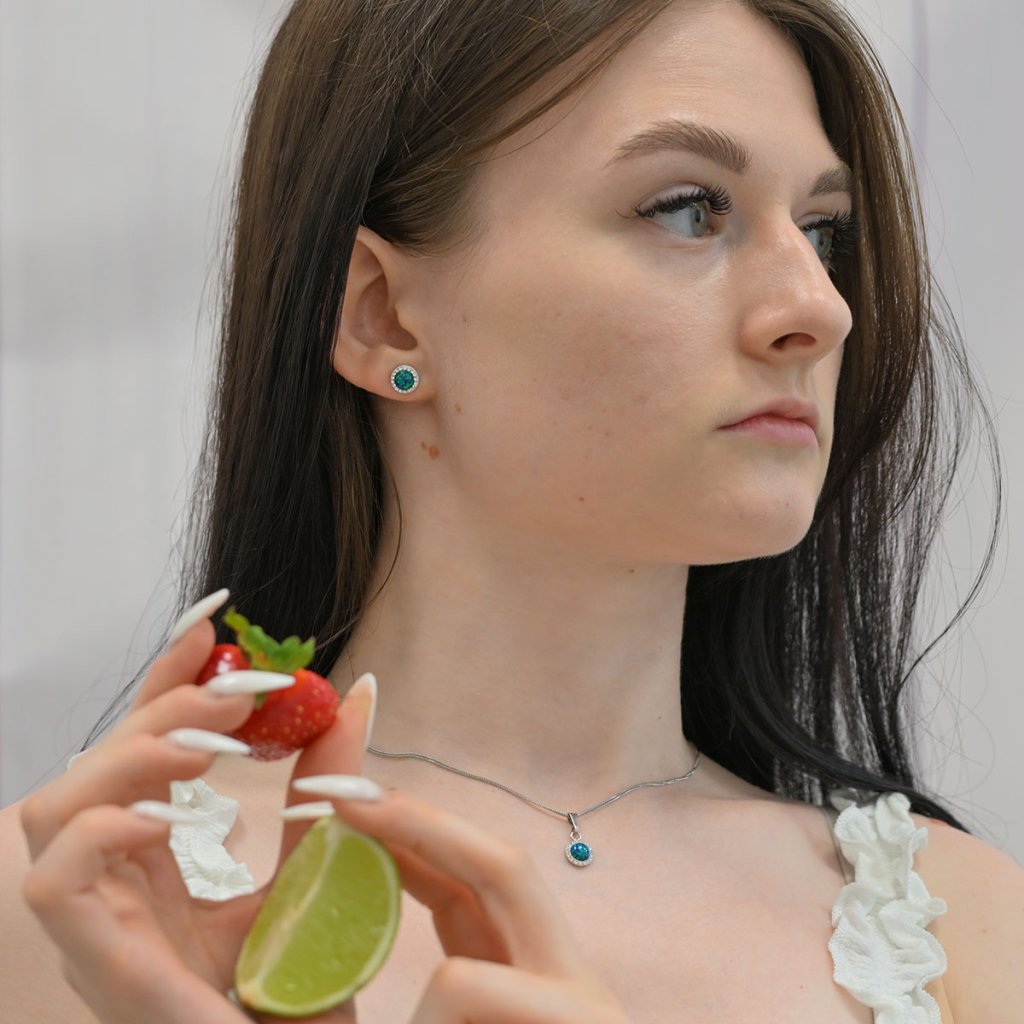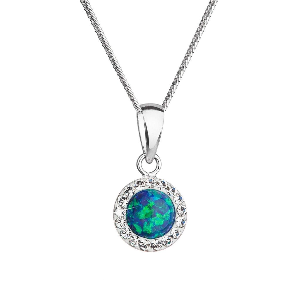 Náhrdelník obsahuje retiazku s okrúhlym príveskom. Šperk je vyrobený zo striebra rýdzosti 925/1000, ktoré prešlo povrchovou úpravou ródiom. Ródium chráni šperk proti sčerneniu, zožltnutiu i poškriabaniu. Prívesok je zdobený zeleným syntetickým opálom , ktorý je navyše olemovaný malými trblietavými Preciosa kryštálmi v bielej farbe. Môžete si k nemu vybrať aj rovnaké náušnice so zapínaním na puzetu alebo skrutku. Keďže šperk neobsahuje žiadny prídavok niklu , môžu ho bez obáv nosiť aj alergici.