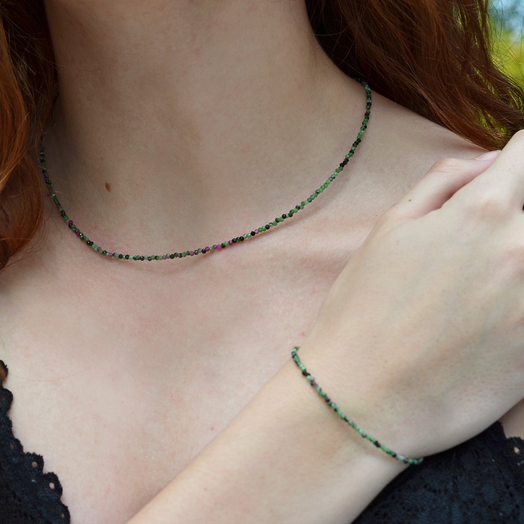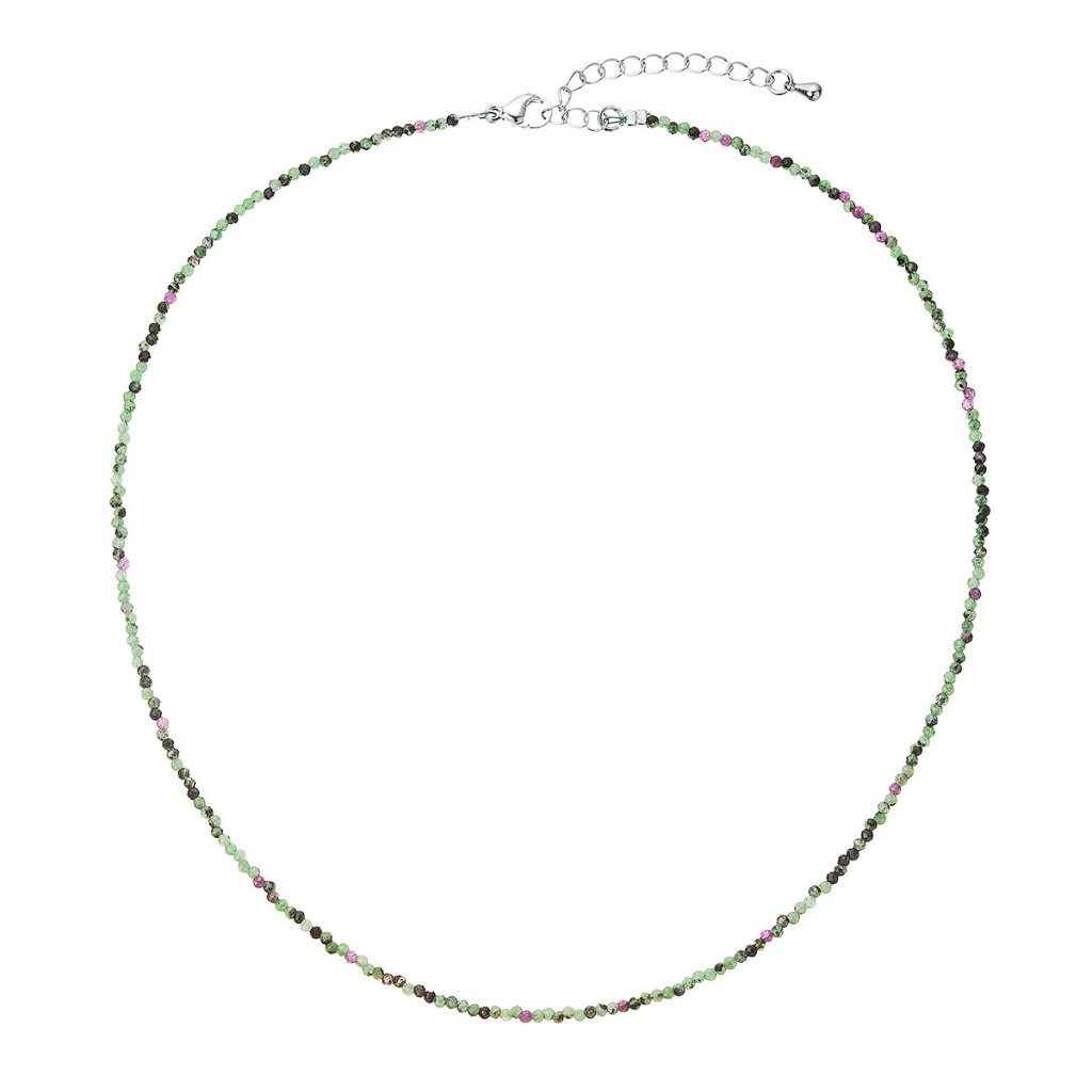 Elegantný náhrdelník z drobných fazetovaných achátových kamienkov v jemne zelených a ružových odtieňoch zaujme svojou prirodzenou krásou a ľahkosťou. Dĺžka náhrdelníka je 39 cm s možnosťou predĺženia o ďalších 5 cm pomocou oceľovej predlžovacej retiazky. Vďaka jemnému brúseniu kamene jemne odrážajú svetlo a dodávajú šperkom nevšedný šarm.