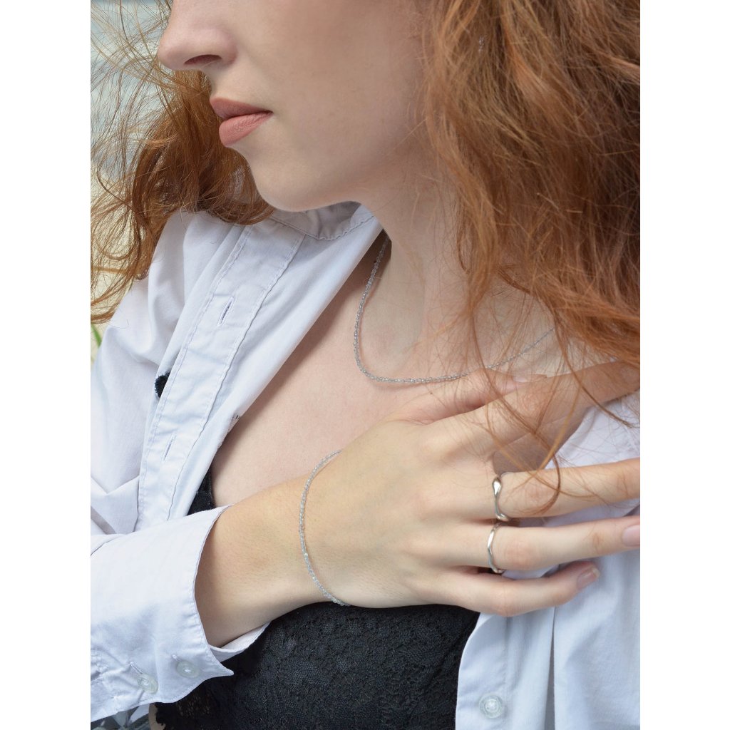 Elegantný náhrdelník z drobných, fazetovaných kamienkov šedého kremeňa očarí svojou prirodzenou krásou a jemným leskom. Vďaka precíznemu fazetovaniu sa kamene nádherne trblietajú pri každom pohybe a dodávajú šperku sofistikovaný vzhľad. Dĺžka náhrdelníka je 39 cm s možnosťou predĺženia o ďalších 5 cm vďaka praktickej oceľovej retiazke. Vďaka svojej neutrálnej farbe sa hodí k širokej škále outfitov, od ležérnych po formálnejšie.