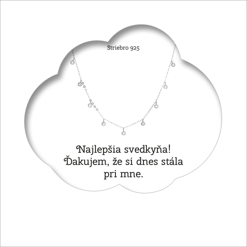 Vybrali sme pre vás limitovanú edíciu darčekovo zabalených šperkov v obláčikovej obálke ako z neba znesené. Nemusíte už nič vymýšľať. Šperk aj kartička s prianím sú tematicky zladené a pripravené ihneď na odovzdanie.Darčekový set obsahuje strieborný náhrdelník s 9 malými okrúhlymi zirkónikmi , ktorý je zavesený na darčekovej karte s nádherným prianím "Najlepšia svedkyňa! Ďakujem, že si dnes stála za mnou". Krásny symbolický darček pre vašu svedkyňu, ktorá je vašou oporou a pomocnou rukou vo svadobný deň.