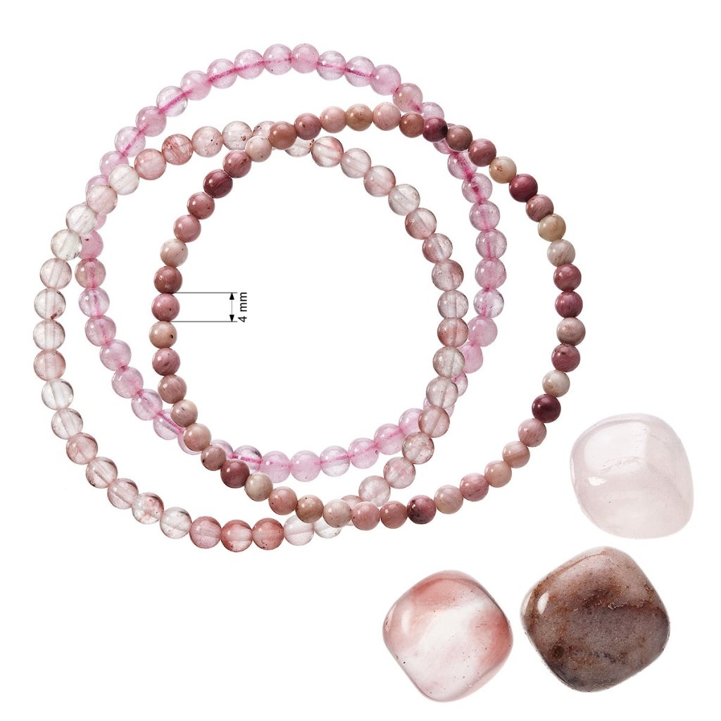 Jedinečná kombinácia ružových náramkov z prírodných minerálnych kameňov podporí Vašu duševnú a fyzickú rovnováhu. Každý, z troch náramkov, je vyrobený z kameňov, ktoré majú rôzne vlastnosti a energie. Popis každého druhu si môžete prečítať nižšie. Tento jemný náramok sa skladá z okrúhlych kamienkov, ktoré sa krásne farebne aj energicky dopĺňajú. Kamienky sú navlečené na elastickom vlákne, čo je vhodné pre rôzne veľkosti zápästia. Náramky sú skvelým darčekom pre každého, kto má rád prírodnú krásu a zaujíma sa o alternatívne spôsoby starostlivosti o duševnú a fyzickú pohodu.Navyše k náramku, máte od nás tri oblé kamene rovnakého materiálu ako sú náramky, na povaľovanie si v ruke na načerpanie energie.