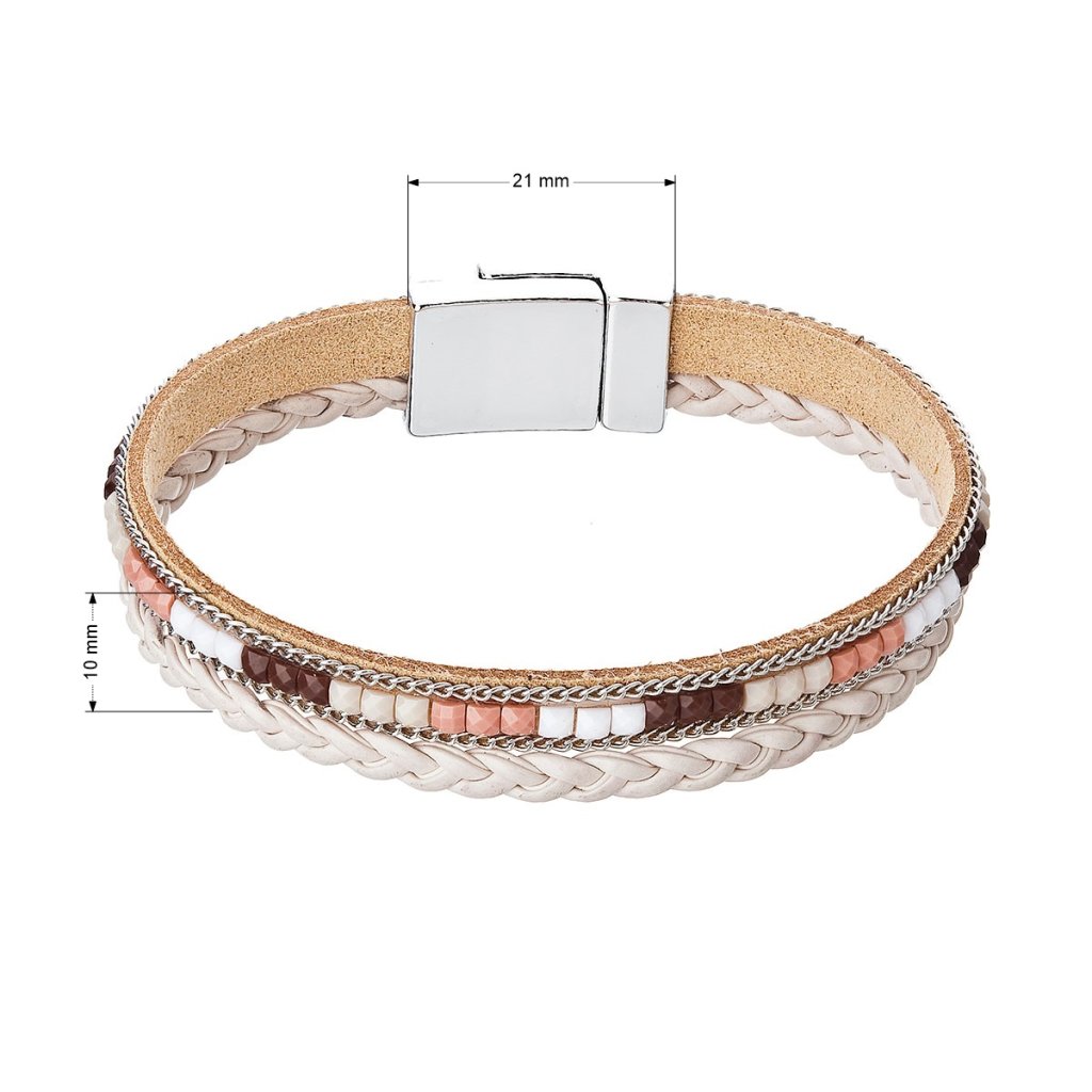 Náramok 53009.3 je tvorený zapletaným vrkôčikom a semišovým pásikom s drobnými korálkami v harmonických farbách – oranžovej, bielej a hnedej. Tieto farby sa striedajú v pravidelnom rytme a vytvárajú pútavý mozaikový efekt. Mozaika z korálikov je po stranách lemovaná jemnými striebornými retiazkami, ktoré dodávajú šperku elegantný lesk.