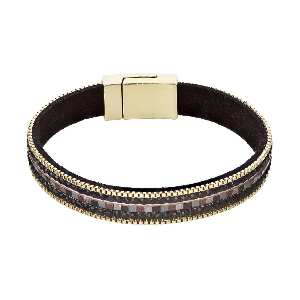 Štýlový náramok, ktorý spája moderný design s efektnými detailmi. Jeho základom je čierny semišový pásik so šírkou 10 mm, ktorý je ozdobený mozaikou z lesklých hranatých korálikov v tlmených tónoch šedej, čiernej a bronzovej. Tento stredový prvok lemujú jemné retiazky z drobných kovových článkov v zlatej farbe, ktoré celku dodávajú nádych luxusu.