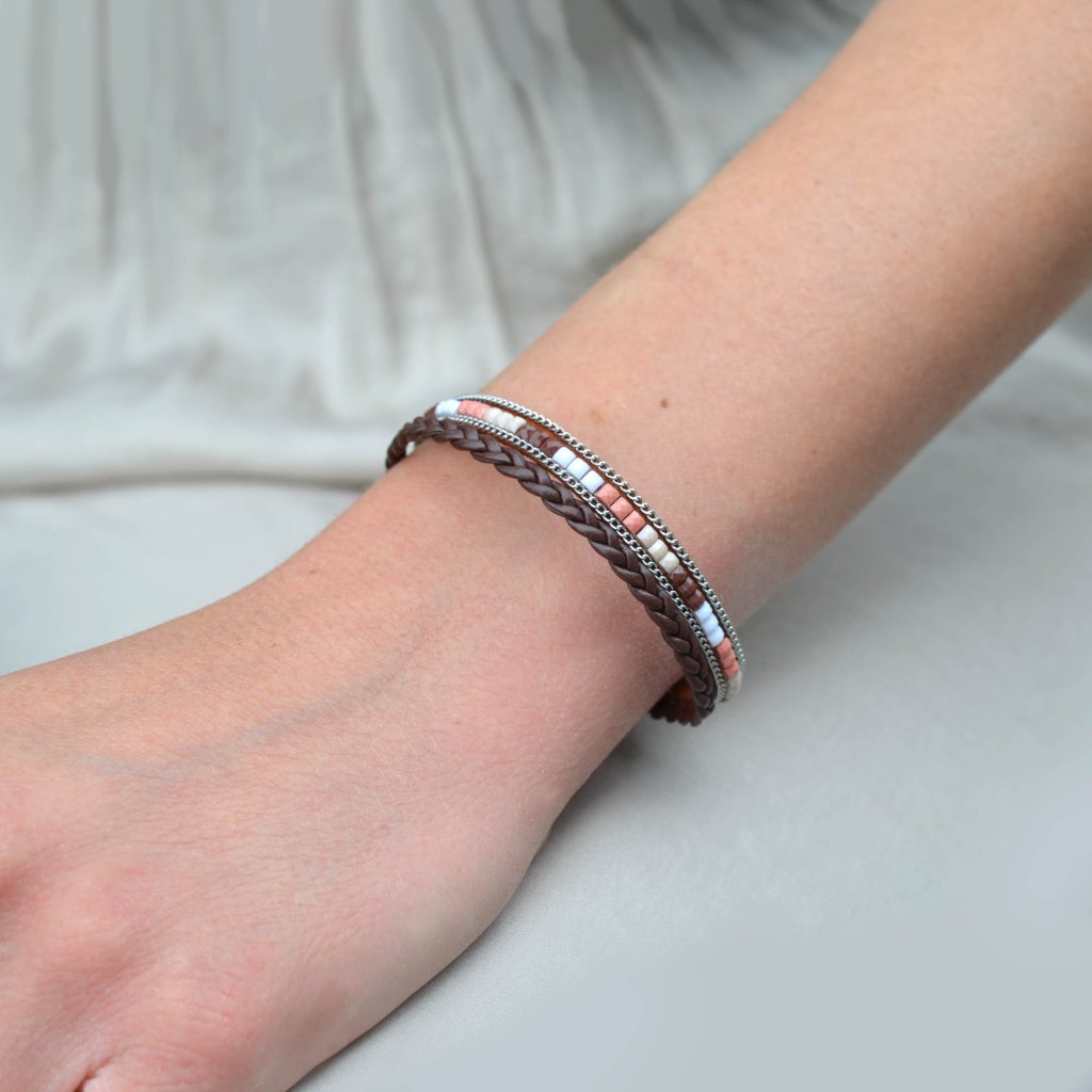 Náramok kombinuje hnedý zapletaný vrkôčik s hladkým semišovým pásikom, na ktorom sú starostlivo usadené drobné korálky v tónoch hnedej, oranžovej, bielej a béžovej. Korálky lemujú jemné strieborné retiazky, ktoré celému šperku dodávajú jemný lesk a vizuálnu rovnováhu.