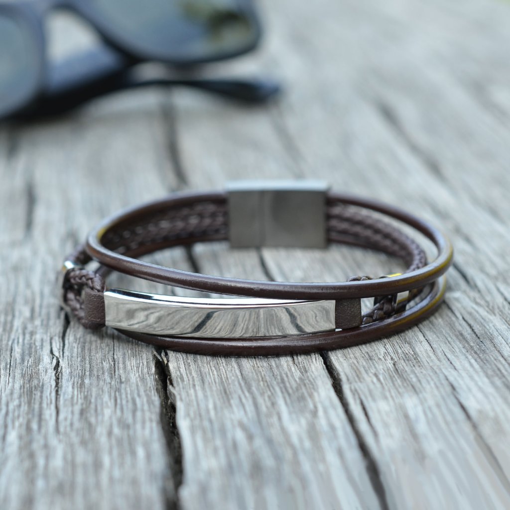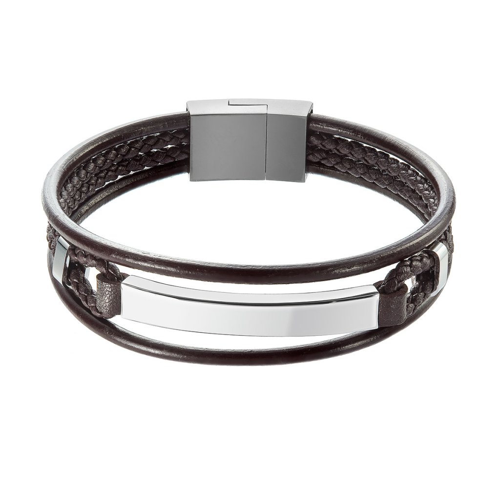 Veľmi populárny módny doplnok, vkusne doplní Váš outfit a pritiahne zaslúženú pozornosť.Pánsky náramok je vyrobený z rôzne tvarovaných pásikov z tmavo hnedej recyklovanej kože a koženky ozdobený oceľovým prvkom, ktorá upúta pozornosť okolia.