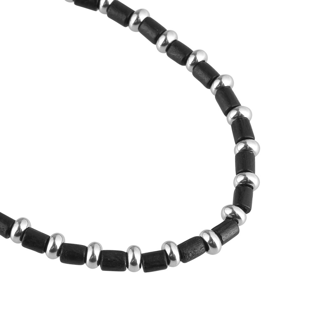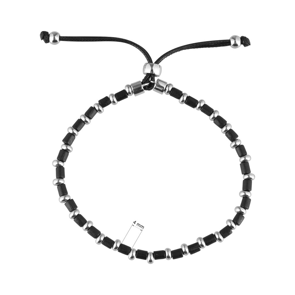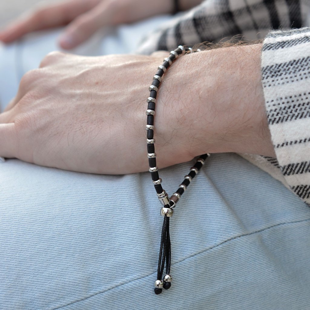 Moderný pánsky náramok, ktorý kombinuje prírodné čierne drevo a oceľové prvky v elegantnom striedavom usporiadaní. Tento šperk spája teplo organických materiálov s chladnou eleganciou kovu, čím vytvára jedinečný kontrast. Elastický dizajn s posuvnou nastaviteľnou brzdou zaisťuje ľahké nasadzovanie a pohodlné nosenie, prispôsobujúce sa rôznym veľkostiam zápästia. Ideálny doplnok pre mužov, ktorí oceňujú originálny a praktický design s nádychom prírody.