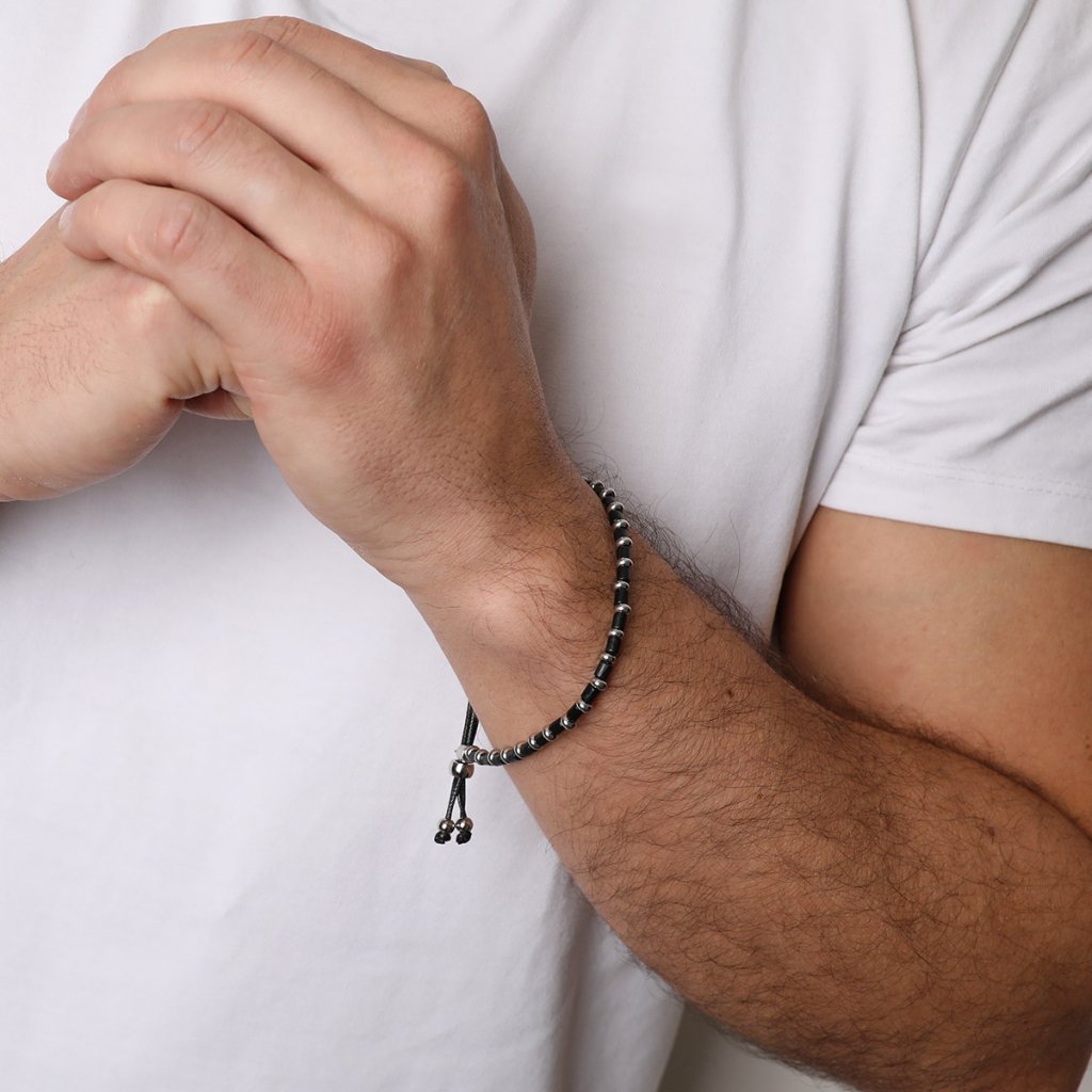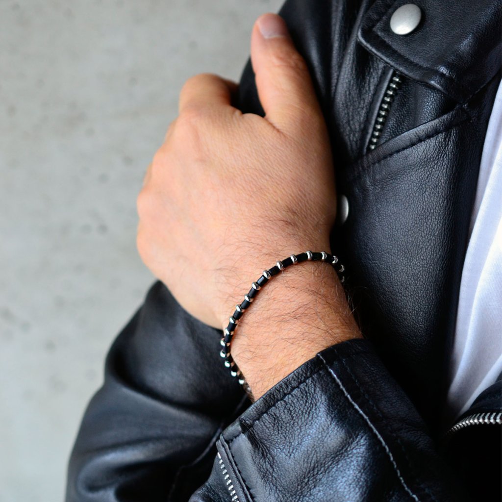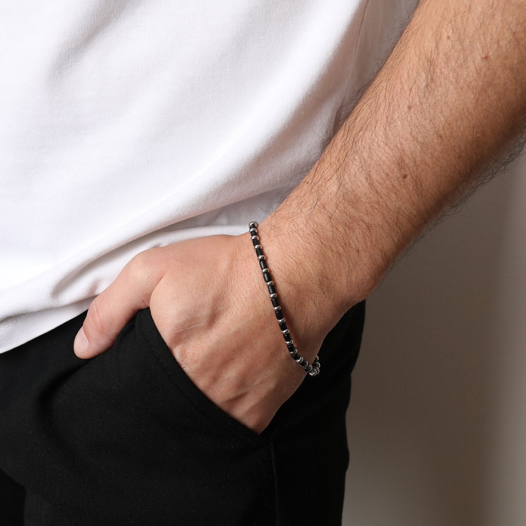 Moderný pánsky náramok, ktorý kombinuje prírodné čierne drevo a oceľové prvky v elegantnom striedavom usporiadaní. Tento šperk spája teplo organických materiálov s chladnou eleganciou kovu, čím vytvára jedinečný kontrast. Elastický dizajn s posuvnou nastaviteľnou brzdou zaisťuje ľahké nasadzovanie a pohodlné nosenie, prispôsobujúce sa rôznym veľkostiam zápästia. Ideálny doplnok pre mužov, ktorí oceňujú originálny a praktický design s nádychom prírody.