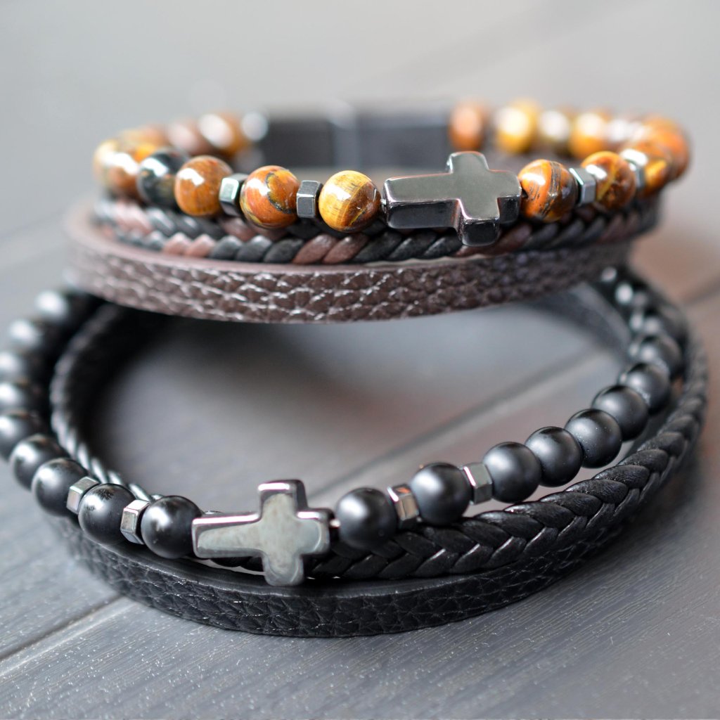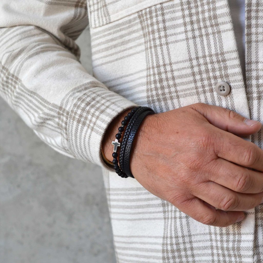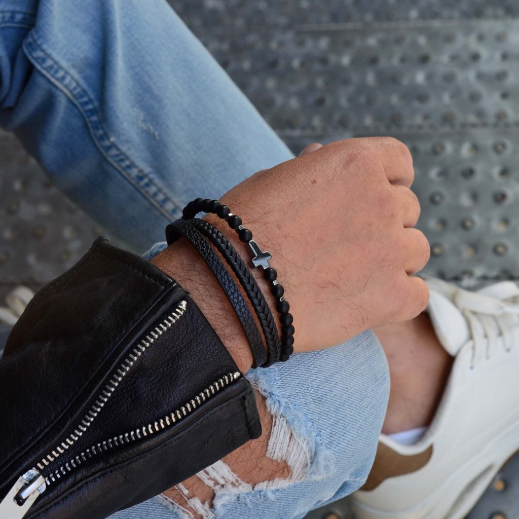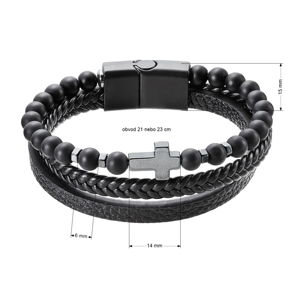 Tento elegantný náramok kombinuje koženku a matné čierne korálky, čo vytvára štýlový doplnok pre každého muža. Čierna farba a hematitový kríž dodávajú náramku nadčasový vzhľad.