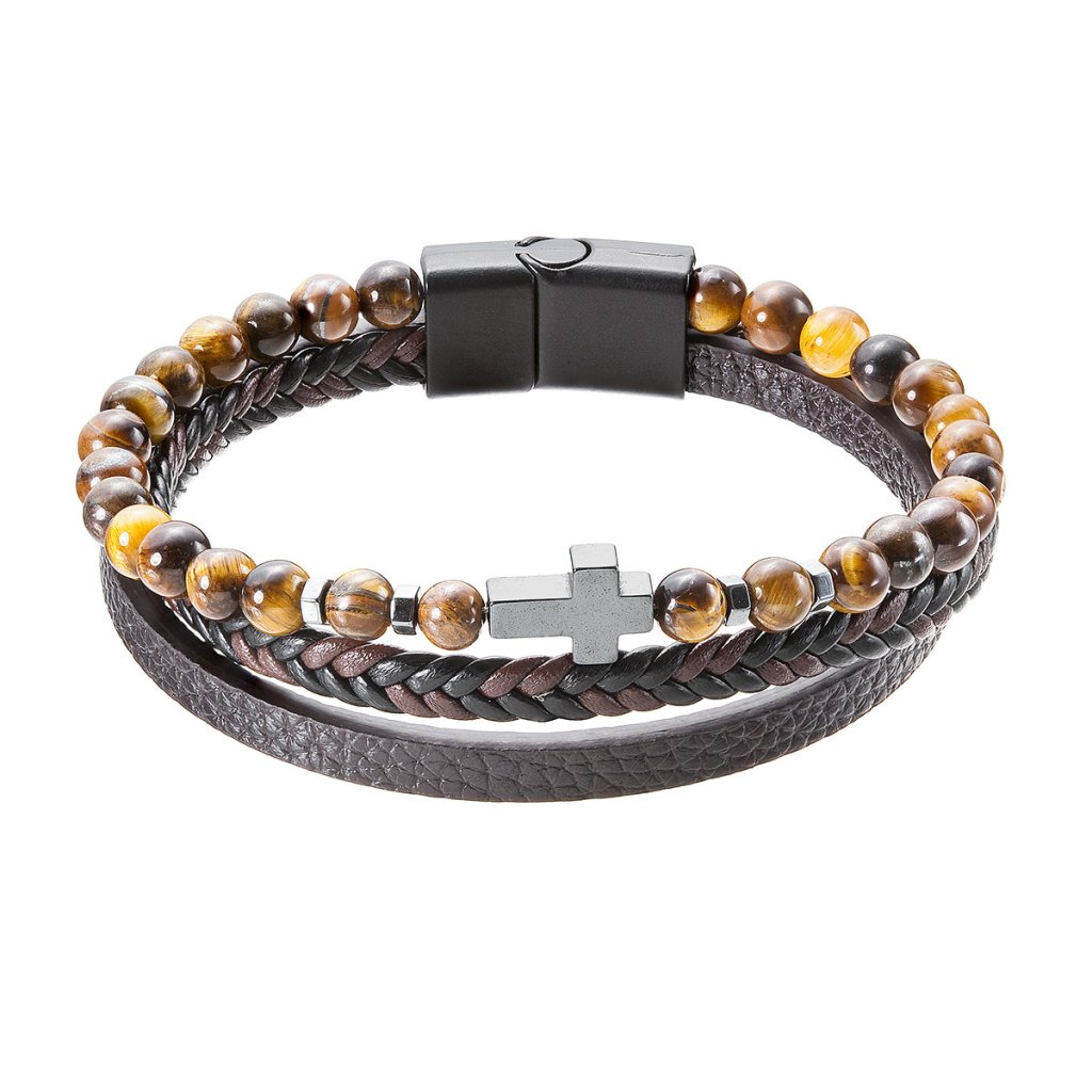 Náramok pánsky koženka a korálky tigrie oko s krížikom 43044.3 hnedý