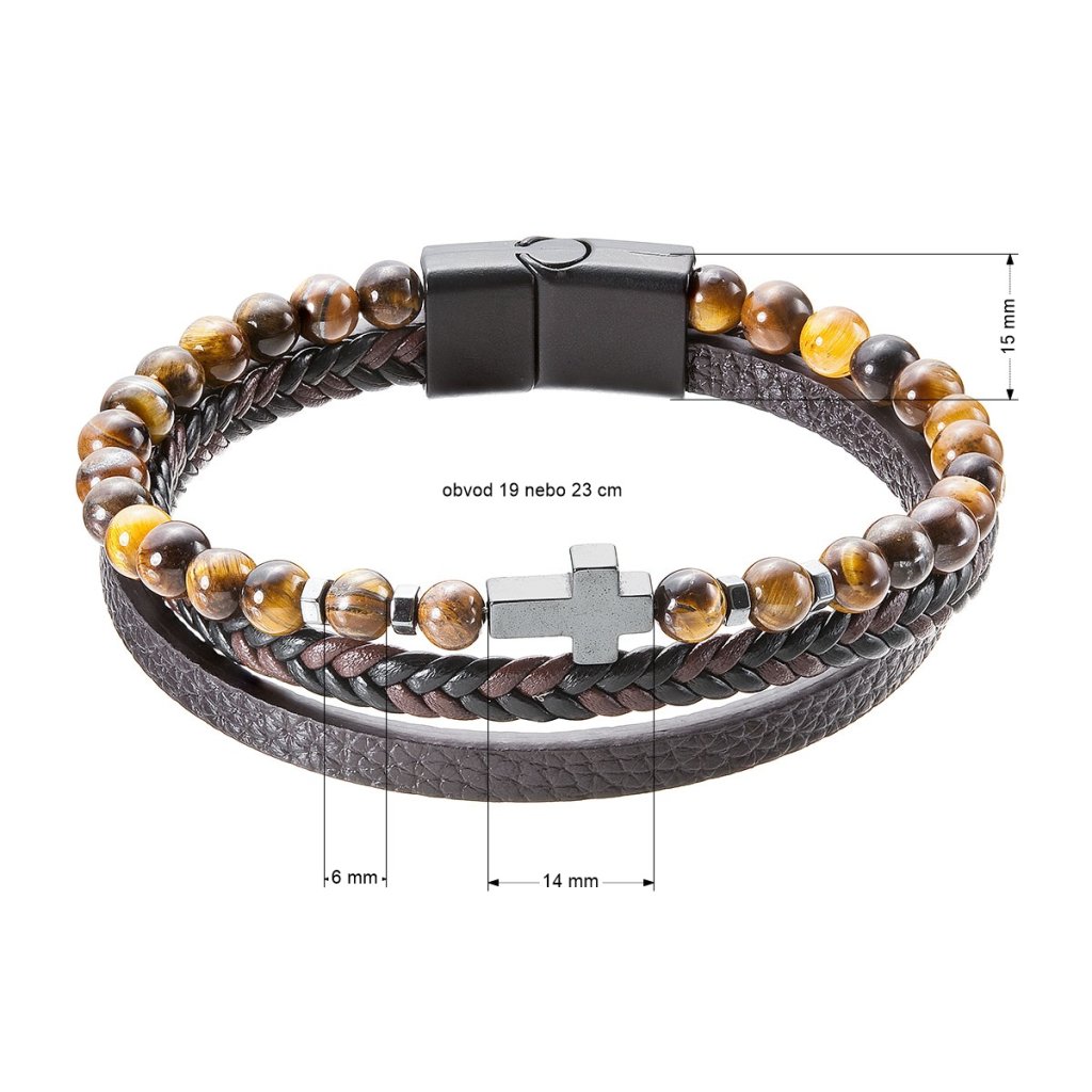 Parametre pánskeho náramku koženka a korálky tigrie oko s krížikom 43044.3 hnedý