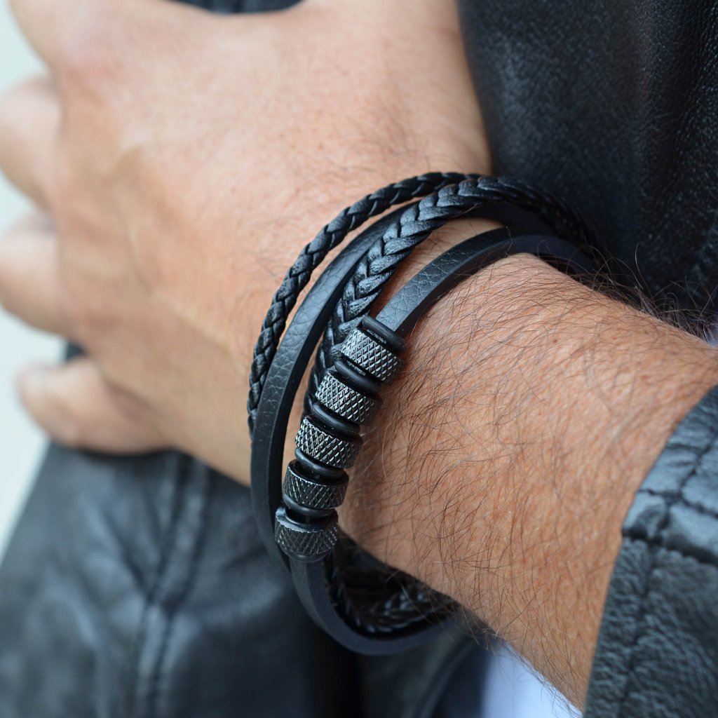 Exkluzívny pánsky náramok pre moderných mužov! V dnešnej dobe svoje ruky radi zdobia aj muži, náramok je vhodným darčekom pre mužov. Náramok je vyrobený zo štyroch koženkových pásikov rôzneho designu.Zapínanie je ozdobné čierne a magnetické , ktoré sa otvára do strany. Dĺžka náramku je 22 cm. Šperk neobsahuje nikel, a tak sa nemusíte obávať žiadne alergické reakcie.