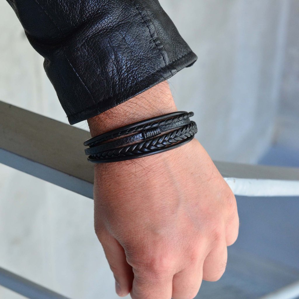 Exkluzívny pánsky náramok pre moderných mužov! V dnešnej dobe svoje ruky radi zdobia aj muži, náramok je vhodným darčekom pre mužov. Náramok je päťradový, vyrobený z pásikov rôznych tvarov z koženky.Zapínanie je ozdobné čierne a magnetické , ktoré sa otvára do strany. Dĺžka náramku je 21 cm. Šperk neobsahuje nikel, a tak sa nemusíte obávať žiadne alergické reakcie.