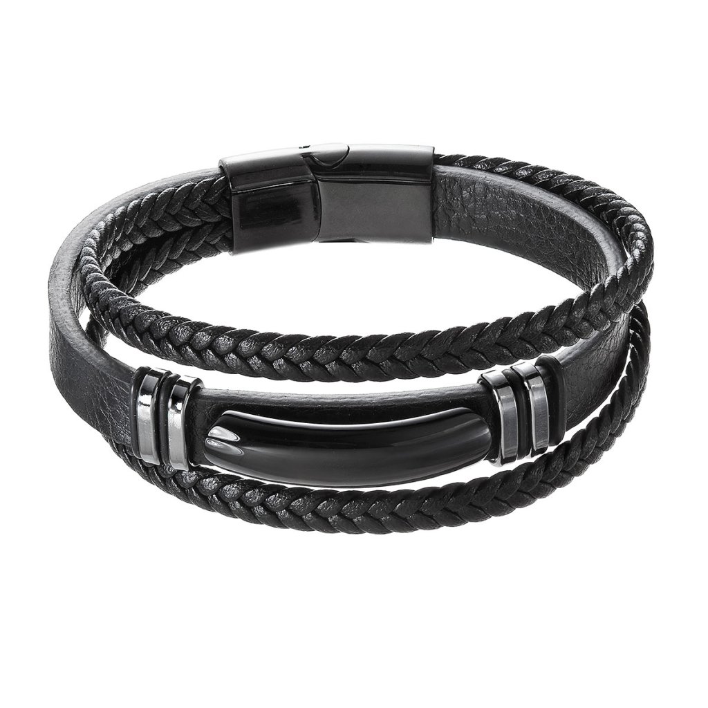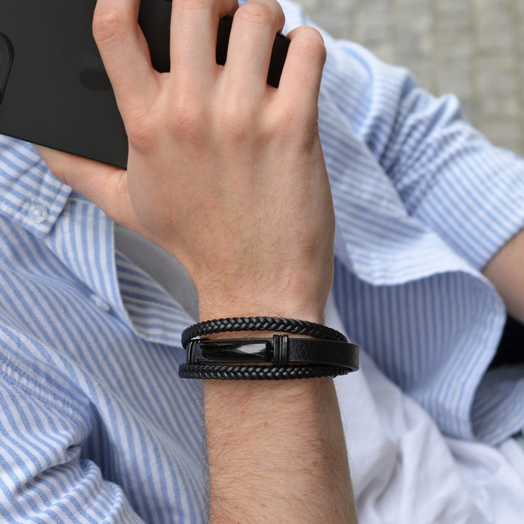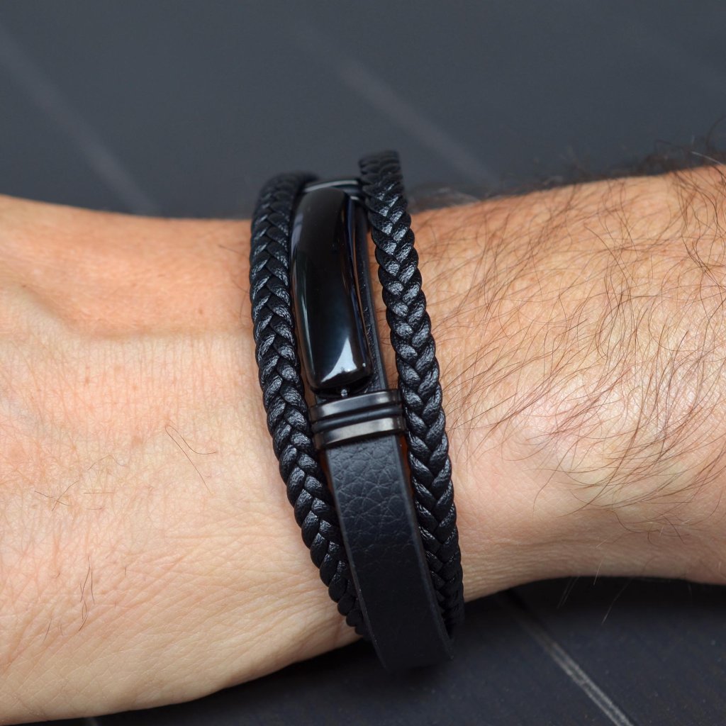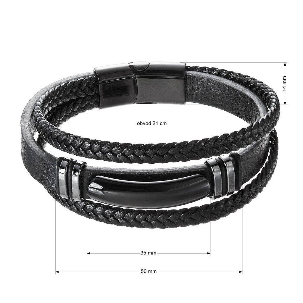 Pánsky náramok je vyrobený z dvoch pásikov zapletených a jedného silného pásika s čiernou luxusnou ozdobou.