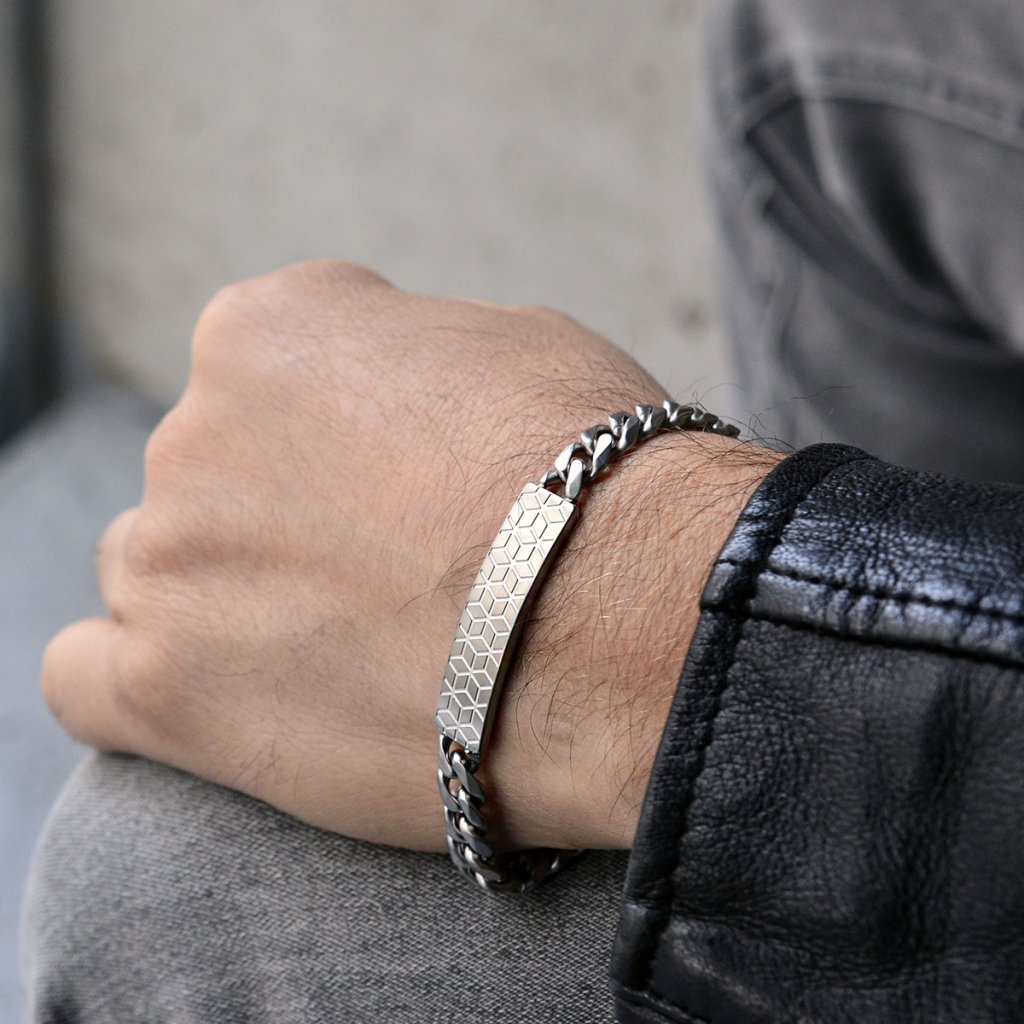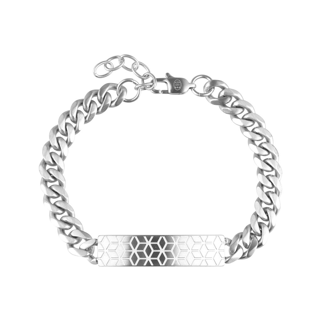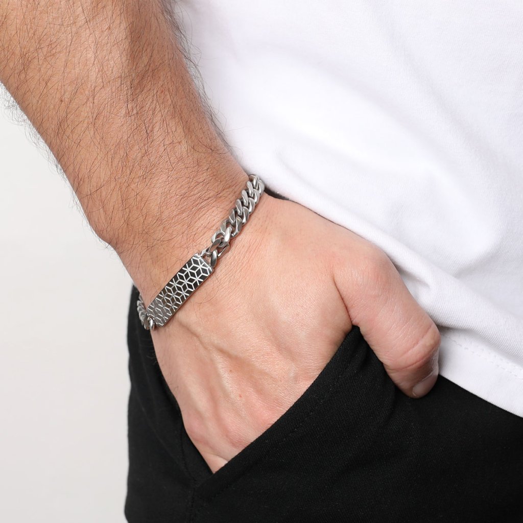 Masívny pánsky náramok z pieskovanej ocele, ktorý spája robustný štýl s modernou eleganciou. Hlavným dizajnovým prvkom je ozdobná obdĺžniková doštička, ktorá dodáva šperku jedinečný a sofistikovaný vzhľad. Povrchová úprava pieskovaním vytvára matný efekt, ktorý podčiarkuje mužnosť a odolnosť náramku. Ideálny doplnok pre mužov, ktorí hľadajú výrazný, ale zároveň univerzálny šperk na každodenné nosenie aj špeciálne príležitosti. Nastaviteľná dĺžka 20+3 cm umožňuje prispôsobenie pre perfektné padnutie.
