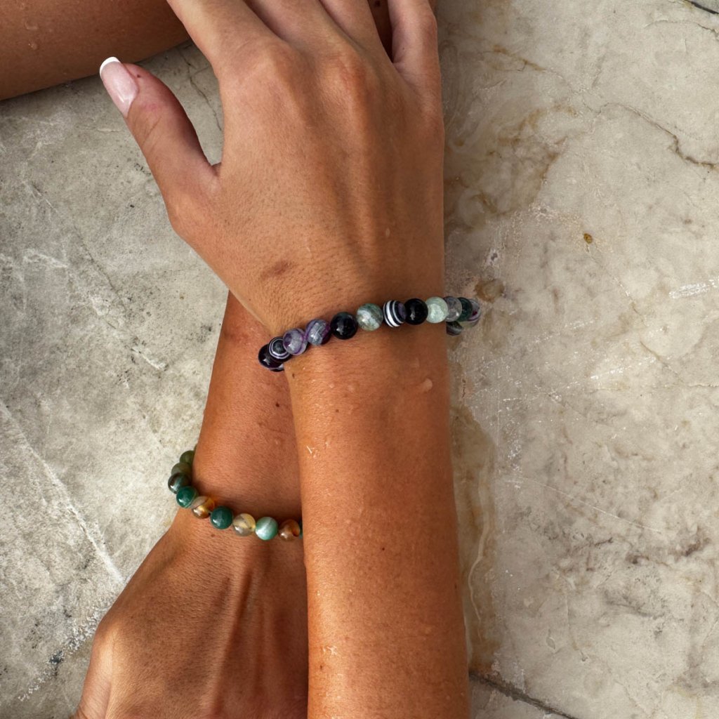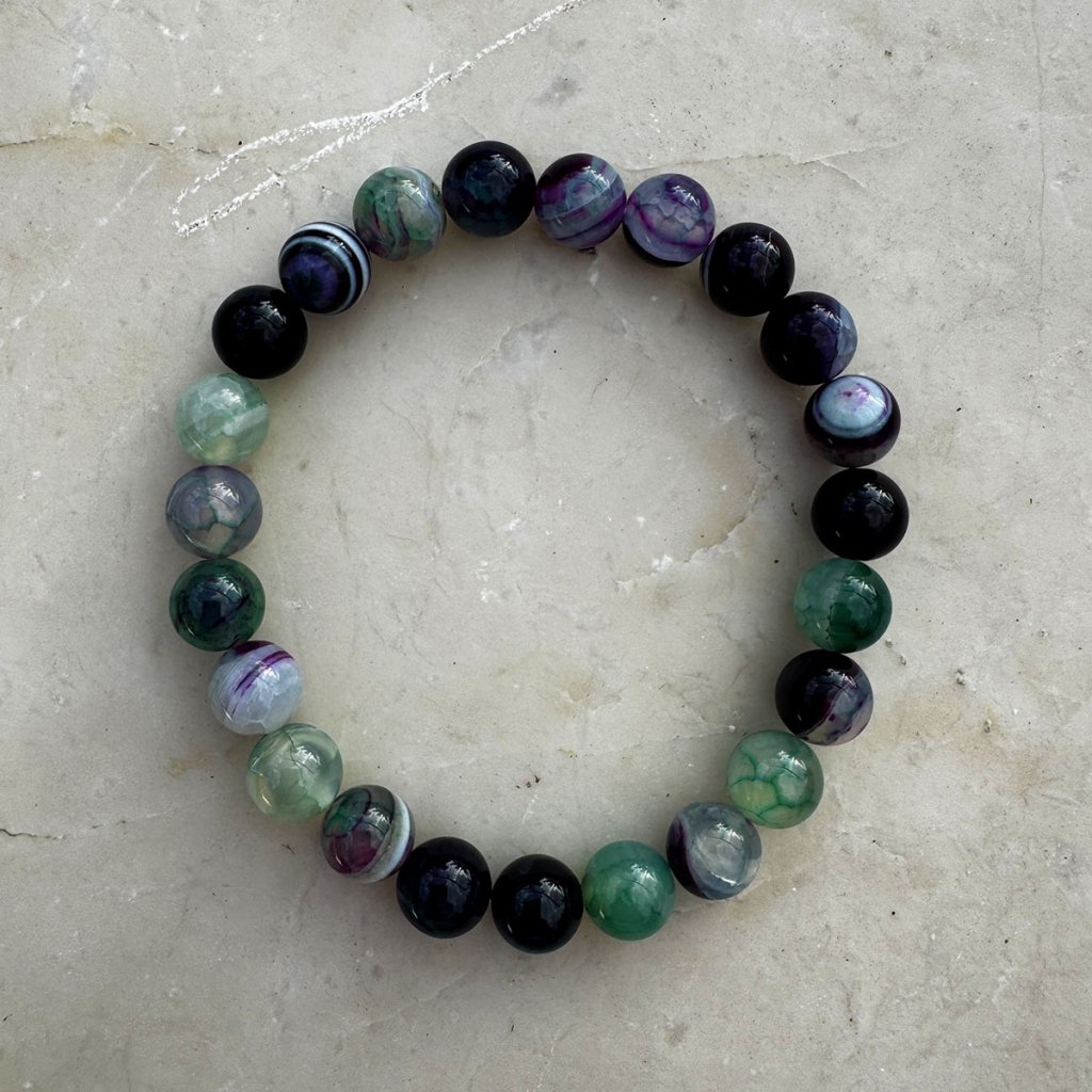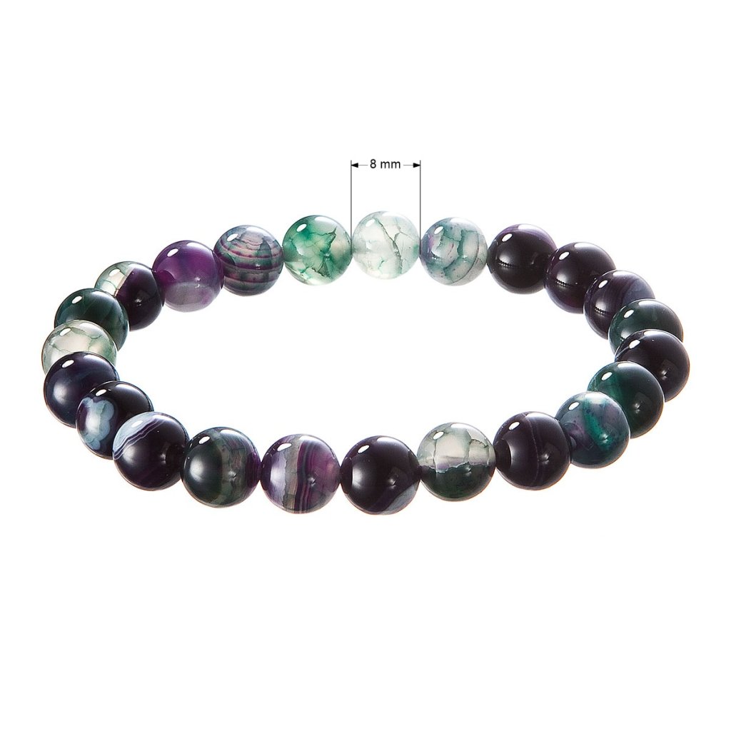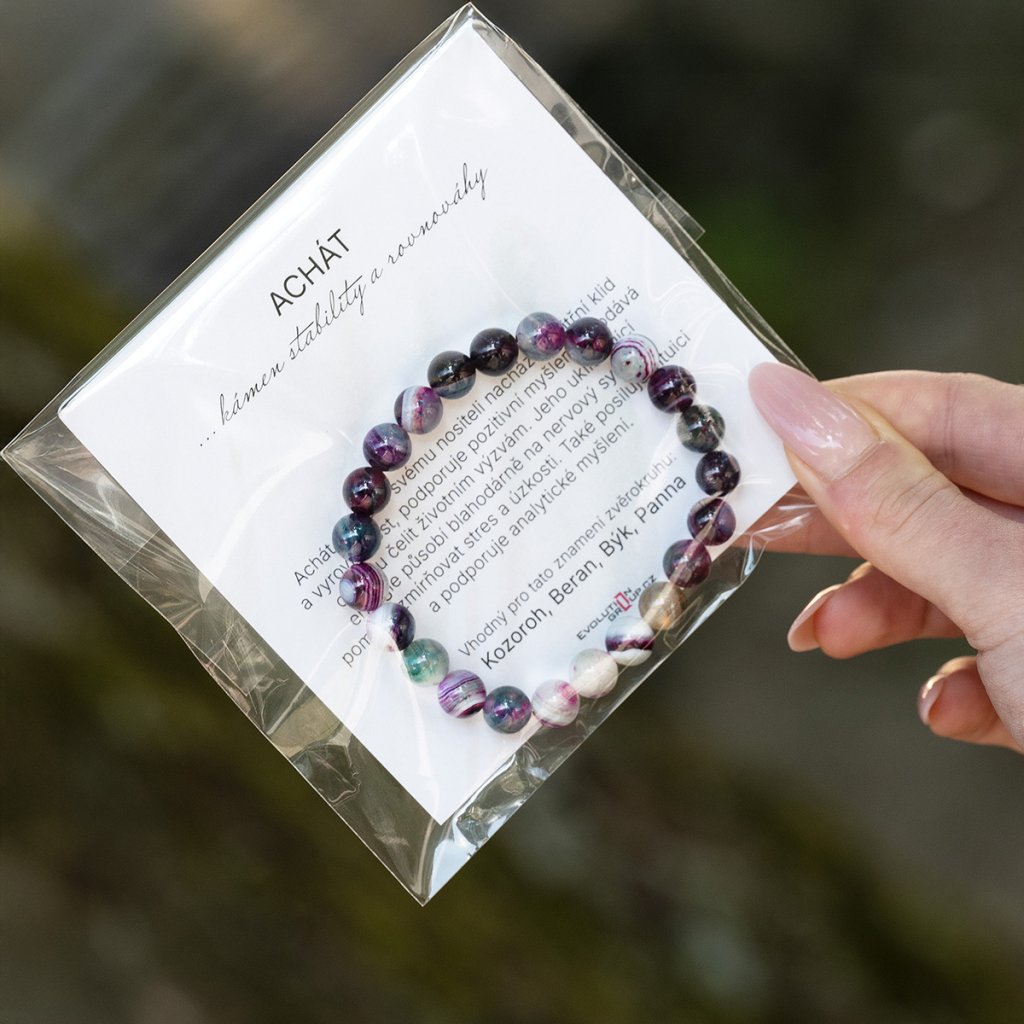 Elegantný náramok z pravého achátu zaujme svojou bohatou farebnosťou – korálky sa prirodzene vyskytujú v harmonických tónoch zelenej, fialovej, bielej a šedej. Každá korálka má originálnu kresbu a odtieň, vďaka čomu je každý náramok úplný unikát. Kombinácia farieb pôsobí vyvážene a štýlovo, a hodí sa k akémukoľvek outfitu.