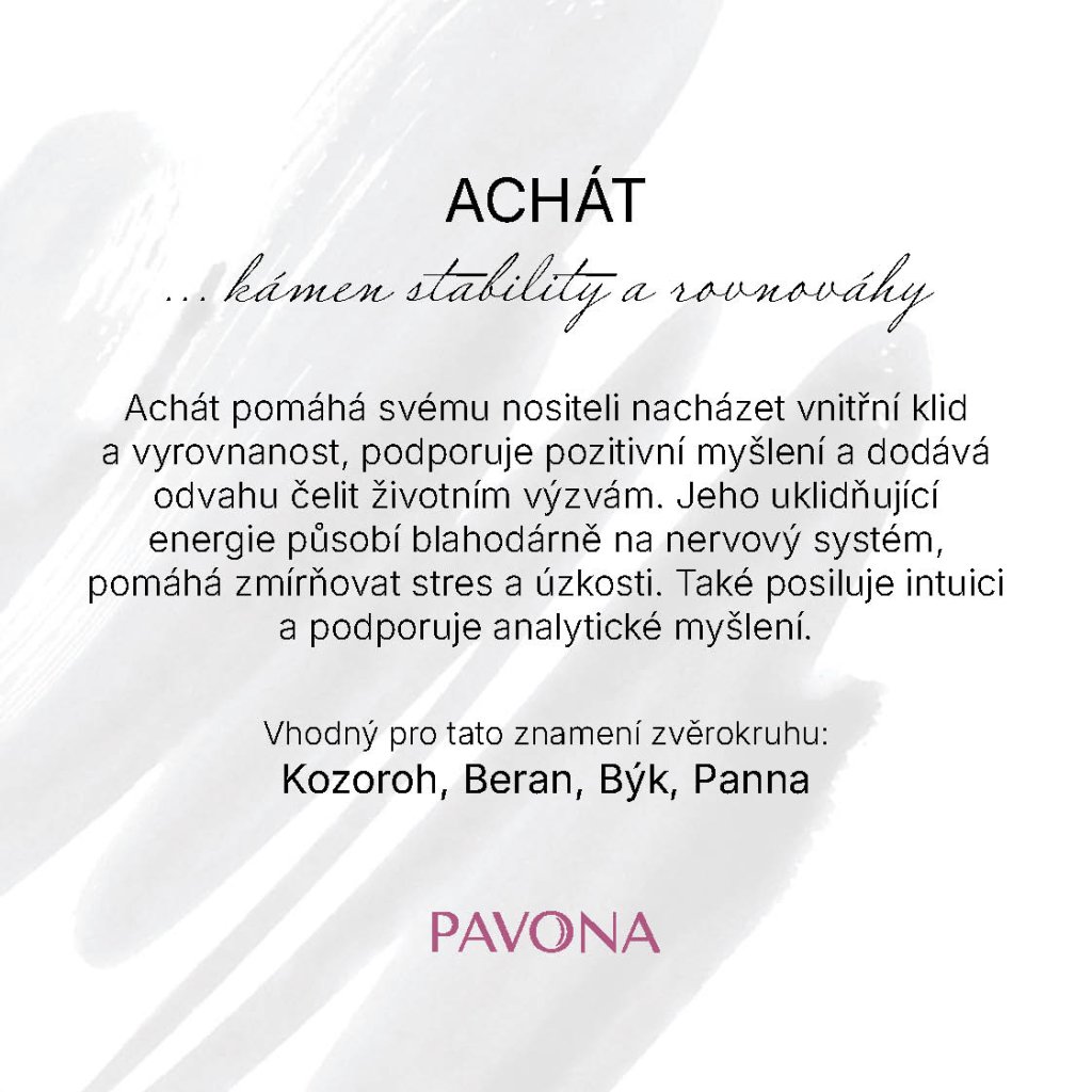 Achát je silný ochranný kameň , ktorý prináša stabilitu, uzemnenie a vnútornú silu. Pomáha zvládať stres, harmonizuje telo aj myseľ a podporuje vytrvalosť. Jeho energia upokojuje, posilňuje sebadôveru a prispieva k celkovej pohode v každodennom živote.