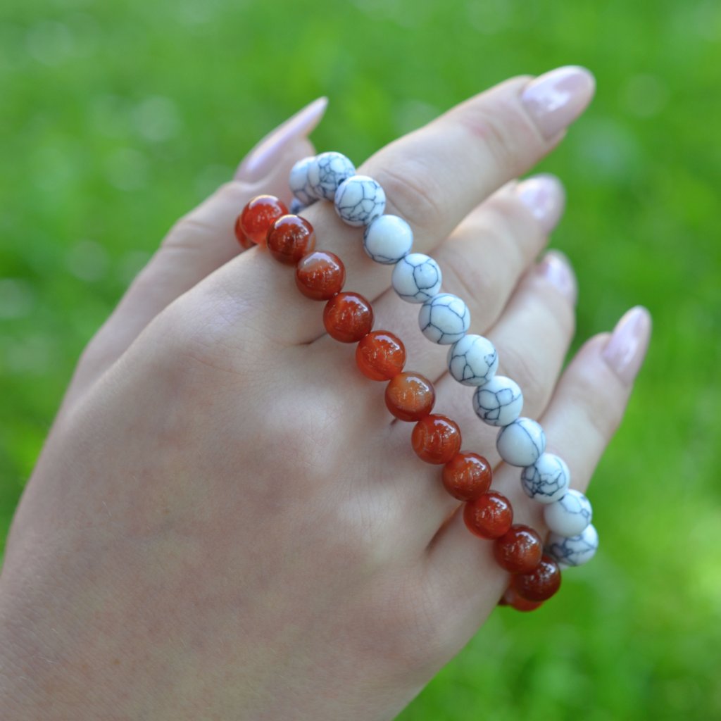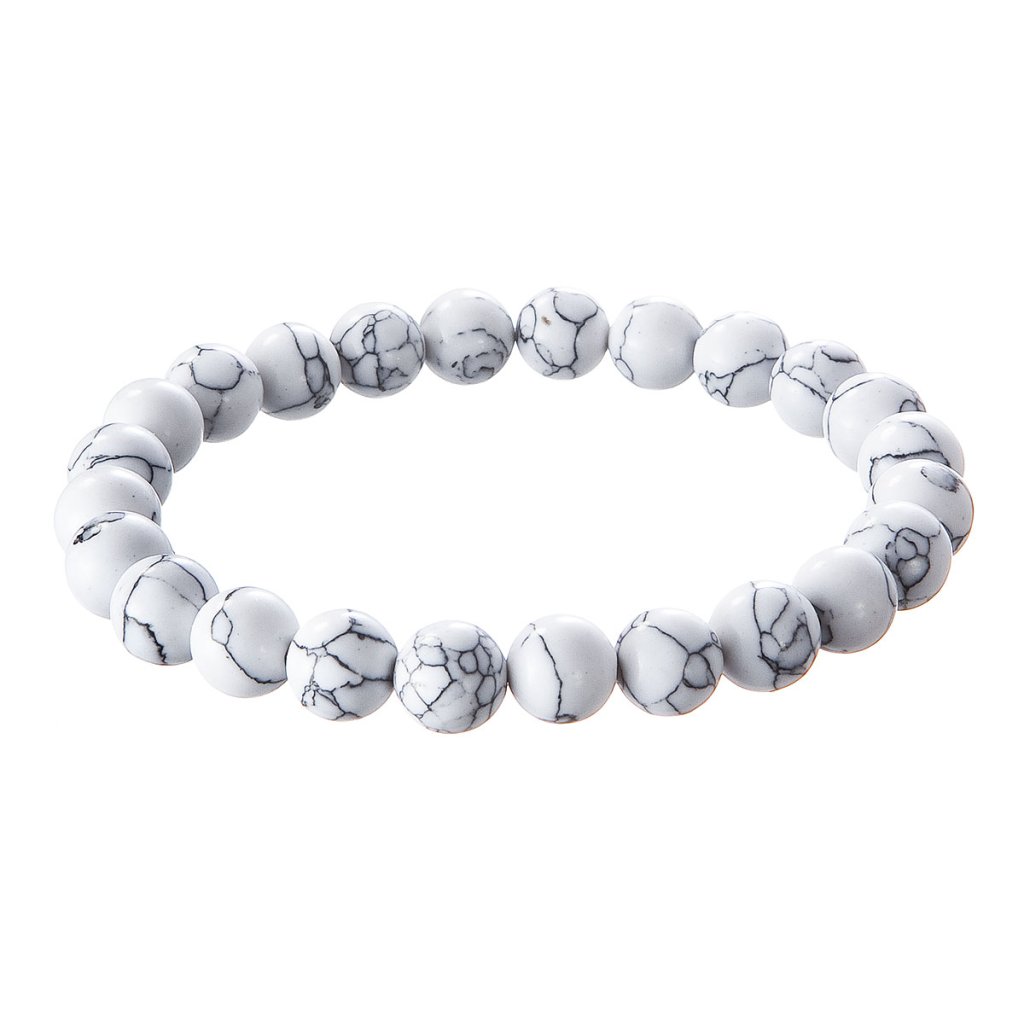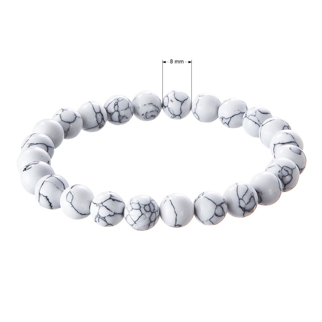 Elegantný náramok z pravého howlitu zaujme svojou jemnou eleganciou – biele až smotanové koráliky s typickou šedou žilnatinou vytvárajú harmonický celok, ktorý pôsobí čisto, pokojne a štýlovo zároveň. Hladké korálky s priemerom 8 mm majú matný povrch a prírodný vzhľad, vďaka čomu sa náramok hodí k akémukoľvek outfitu aj príležitosti.