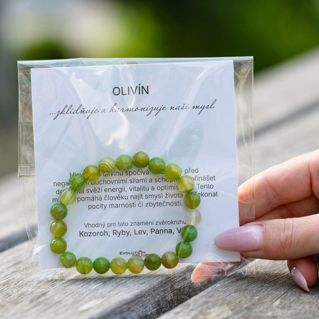 Náramok je navlečený na kartičke s popisom vlastností olivínu a uložený v ochrannom sáčku. Súčasťou balenia je aj darčeková taštička – ideálna ako darček s dušou alebo osobný posilňujúci doplnok.