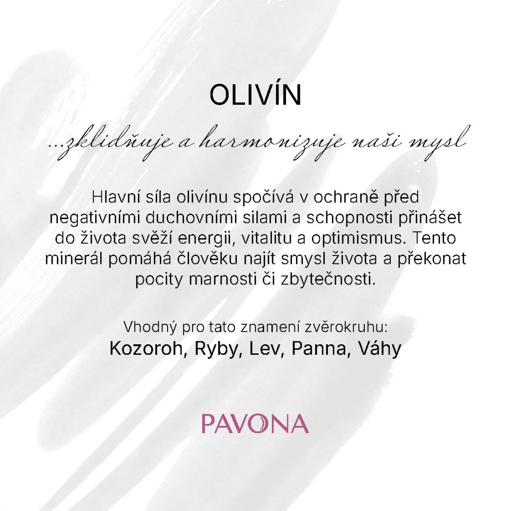 Olivín je oddávna spájaný s obnovou, radosťou a ochranou. Pomáha uvoľniť staré emočné bremená, otvára srdce novým zážitkom a podporuje sebavedomie, vitalitu a osobný rast. Jeho jasná, povzbudivá energia pomáha prekonávať negativitu a priťahuje harmóniu vo vzťahoch aj životných situáciách. Olivín je tiež symbolom nových začiatkov a duchovného prebudenia.