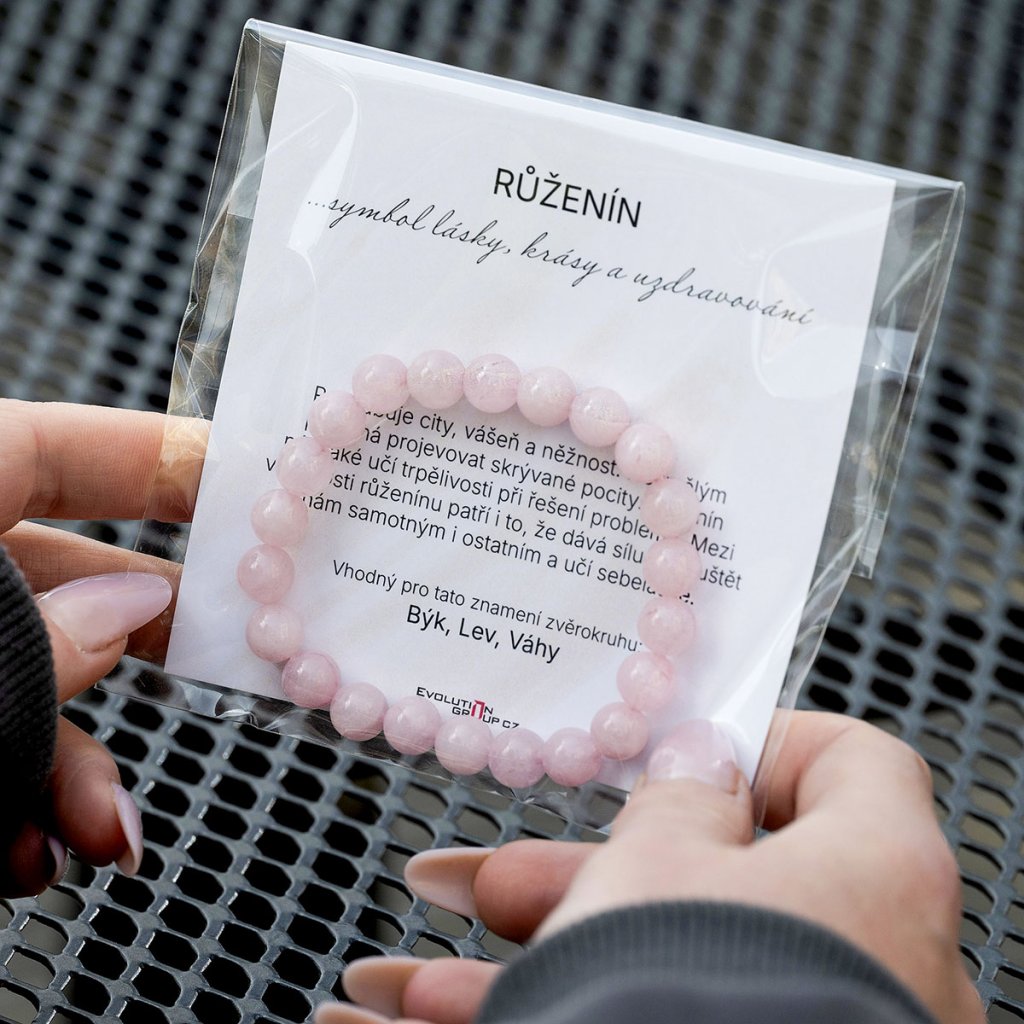 Náramok je navlečený na kartičke s popisom vlastností ruženínu a uložený v ochrannom sáčku. Súčasťou balenia je aj darčeková taštička – ideálna ako darček od srdca alebo osobný amulet na podporu lásky a vnútorného pokoja.
