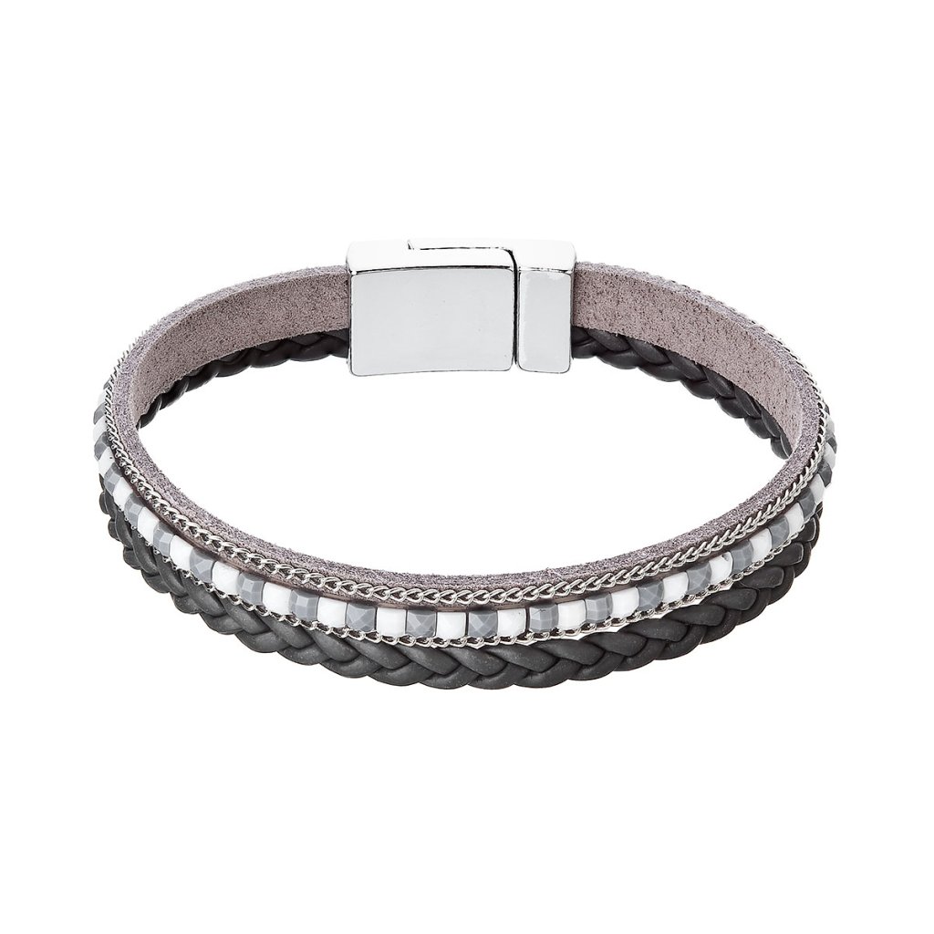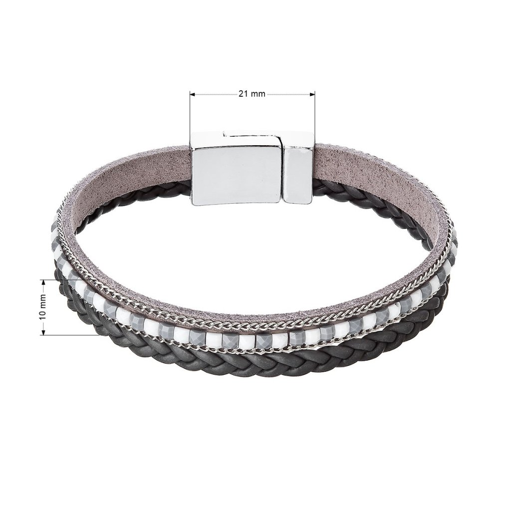 Základ tvorí jemne spletený šedý vrkôčik, ktorý je doplnený o hladký semišový pásik nesúci drobné korálky v šedých a bielych odtieňoch. Táto jednoduchá farebná kombinácia vytvára sofistikovanú mozaiku, ktorá zaujme svojou čistotou a moderným nádychom. Obe strany opasku lemujú strieborné retiazky, ktoré celému náramku dodávajú ľahký ligot bez rušivého efektu.