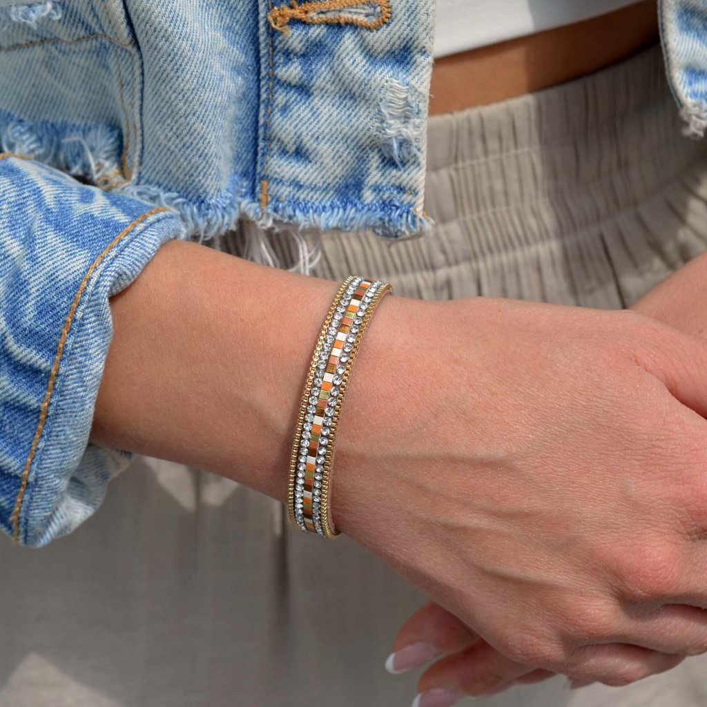 Elegantný dámsky náramok v teplých zlatohnedých tónoch je dokonalým doplnkom pre každodenné nosenie aj slávnostné príležitosti. Základ tvorí hnedý semišový pásik so šírkou 10 mm, ktorý je zdobený dvoma radmi trblietavých čírych kryštálov. Medzi nimi sa nachádza dekoratívny pruh z hranatých korálikov v zlatej, medenej a perleťovo bielej farbe, ktoré náramku dodávajú jemný lesk a jedinečný vzhľad. Po stranách náramku sú jemné kovové retiazky v zlatej farbe, ktoré celkový vzhľad ešte viac zvýrazňujú.