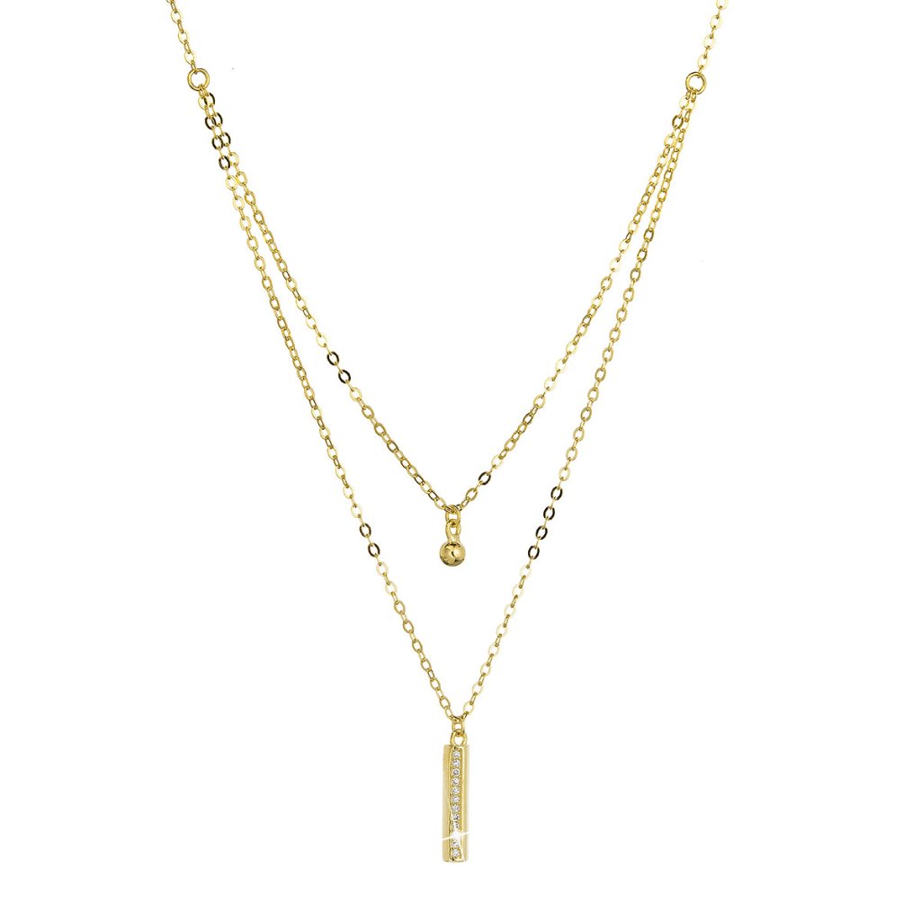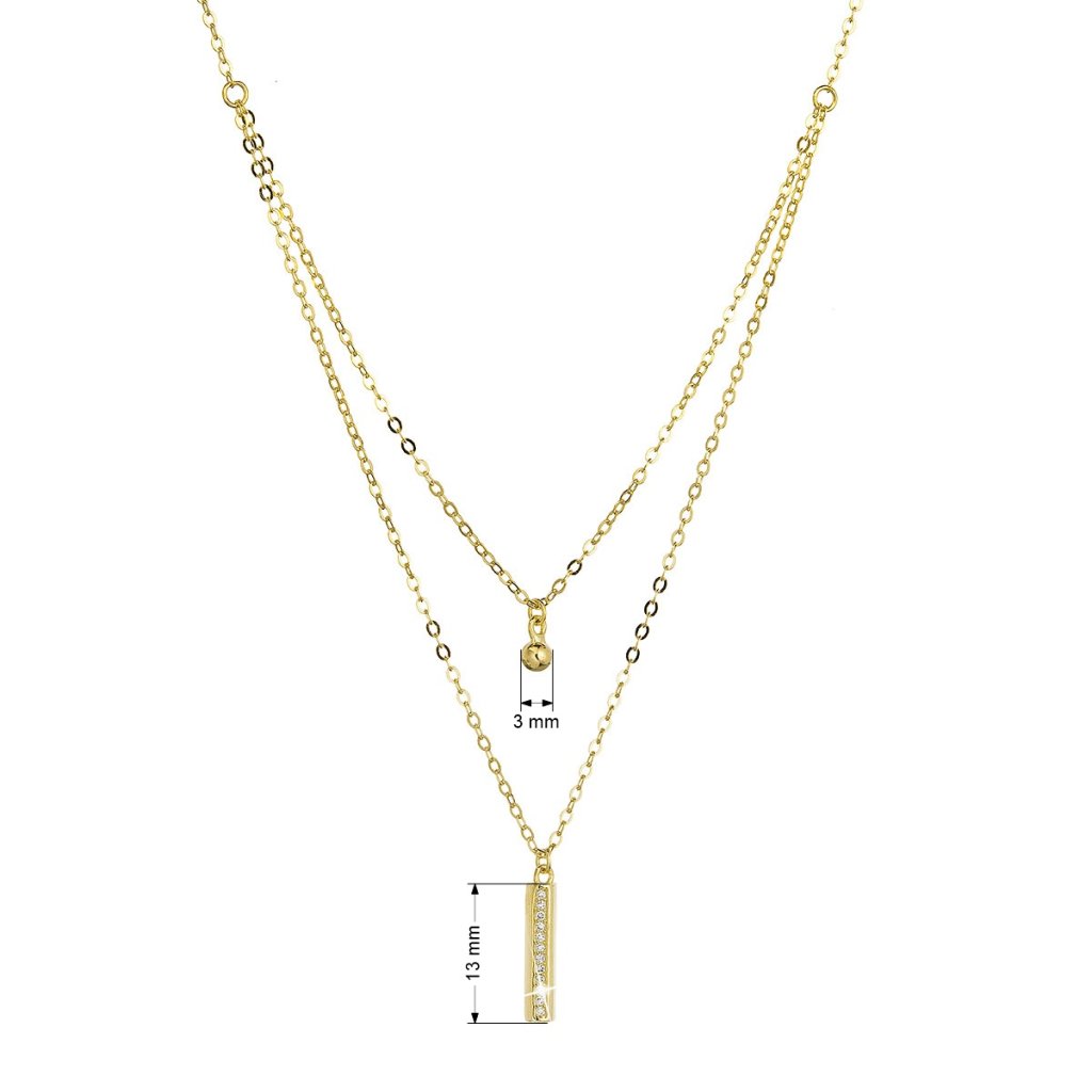 Tento dvojradový pozlátený strieborný náhrdelník s obdĺžnikom bohato vysadeným zirkónmi a guľôčkou má dĺžku 45 cm a je zdobený mnohými malými zirkónmi v bielej farbe iba na obdĺžniku. Na náhrdelník bolo použité striebro rýdzosti 925/1000. Neobsahuje nikel , a tak ho môžu bez obáv nosiť aj alergici.