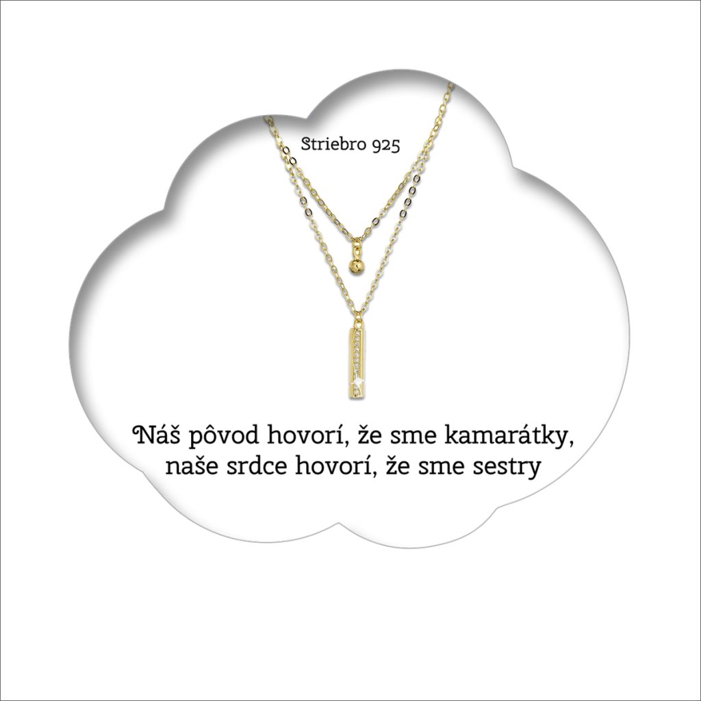 Vybrali sme pre vás limitovanú edíciu darčekovo zabalených šperkov v obláčikovej obálke ako z neba znesené. Nemusíte už nič vymýšľať. Šperk aj kartička s prianím sú tematicky zladené a pripravené ihneď na odovzdanie.Darčekový set obsahuje pozlátený dvojradový strieborný náhrdelník gulička a úzky obdĺžnik so zirkónmi biely , ktorý je zavesený na darčekovej karte s nádherným prianím „Náš pôvod hovorí, že sme kamarátky, naše srdce hovorí, že sme sestry“. Krásny symbolický darček pre vašu kamarátku a najlepšiu priateľku, ktorá je vám blízka, ako vlastná sestra. Náhrdelník symbolizujúci okamihy, ktoré si chcete udržať v pamäti na nekonečne dlho.