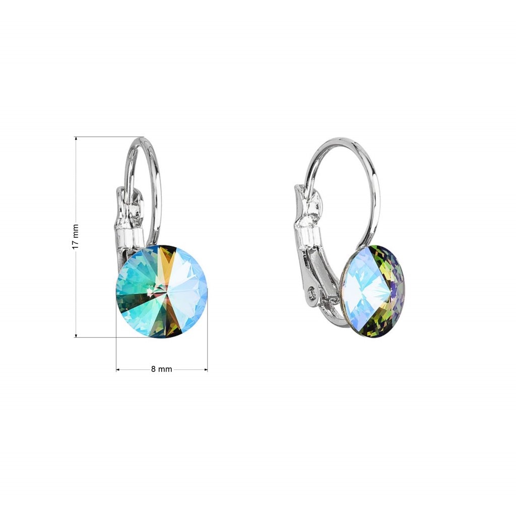 Náušnice majú dĺžku 17 mm a zapínajú sa na klapku . Šperk je zdobený okrúhlym 8 mm širokým Swarovski kryštálom v zeleno-fialovej farbe.