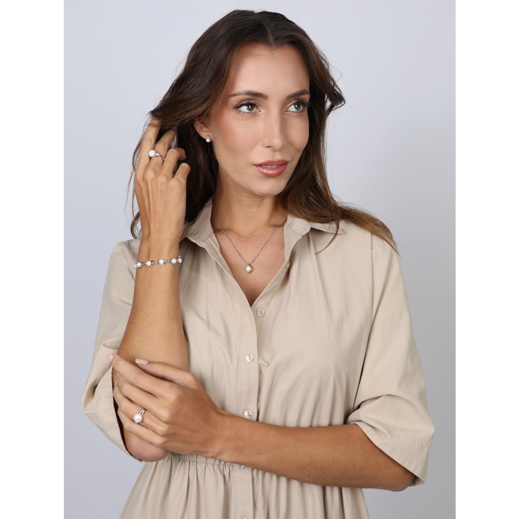 Striebro v tejto súprave nie je len kovom, ale vyjadrením nadčasovej elegancie . Biela riečna perla , použitá ako centrálny prvok, dodáva každému kusu jedinečný nádych luxusu.Súprava z riečnych perál obsahuje jednoduché náušnice a prívesok na striebornej retiazke . Sladkovodné perly, ktorými sú šperky zdobené, majú veľmi vysoký lesk, pretože spadajú do kategórie kvality AAA . Šperky sú vyrobené zo striebra o rýdzosti 925/1000 vrátane povrchovej úpravy ródiom. Súpravu sa nemusia báť zaobstarať ani alergici, pretože šperky neobsahujú žiadny prídavok niklu. Náušnice zapnete na balónik, ktorý ich spoľahlivo ochráni proti nechcenej strate.