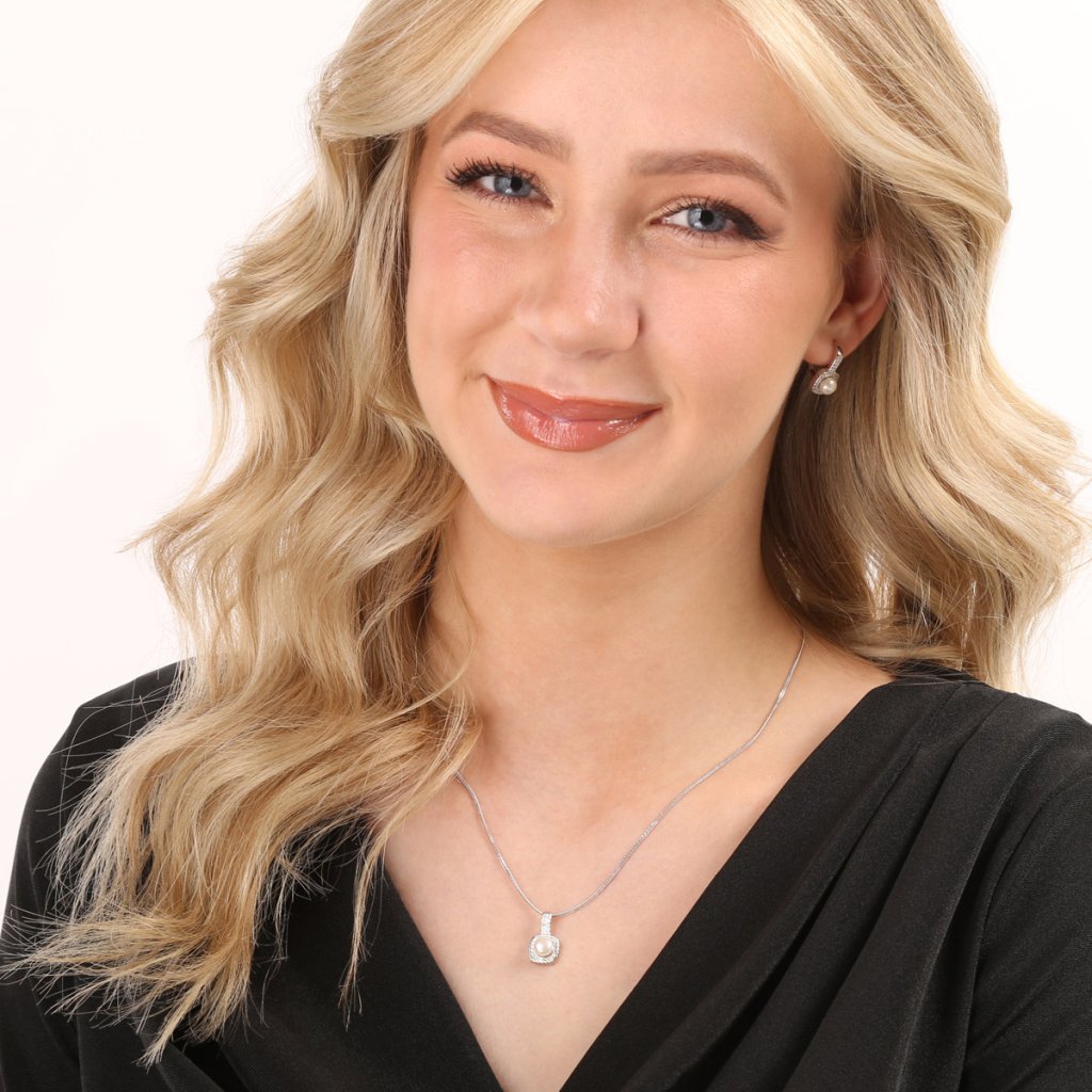 Súprava 29084.1 je vyrobená zo striebra rýdzosti 925/1000 s povrchovou úpravou ródiom a zdobia ju okrúhle biele riečne perly kvality AA . Perly majú priemer 5,5-6 mm , sú vsadené do štvorca, ktorý je vysadený čírymi zirkónmi a tak sa celá pekne trblieta. Náušnice sa zapínajú na klasickú klapku . Súčasťou súpravy je strieborná retiazka s dĺžkou 45 cm. Keďže šperk neobsahuje žiadny prídavok niklu, môžu ho bez obáv nosiť aj alergici.