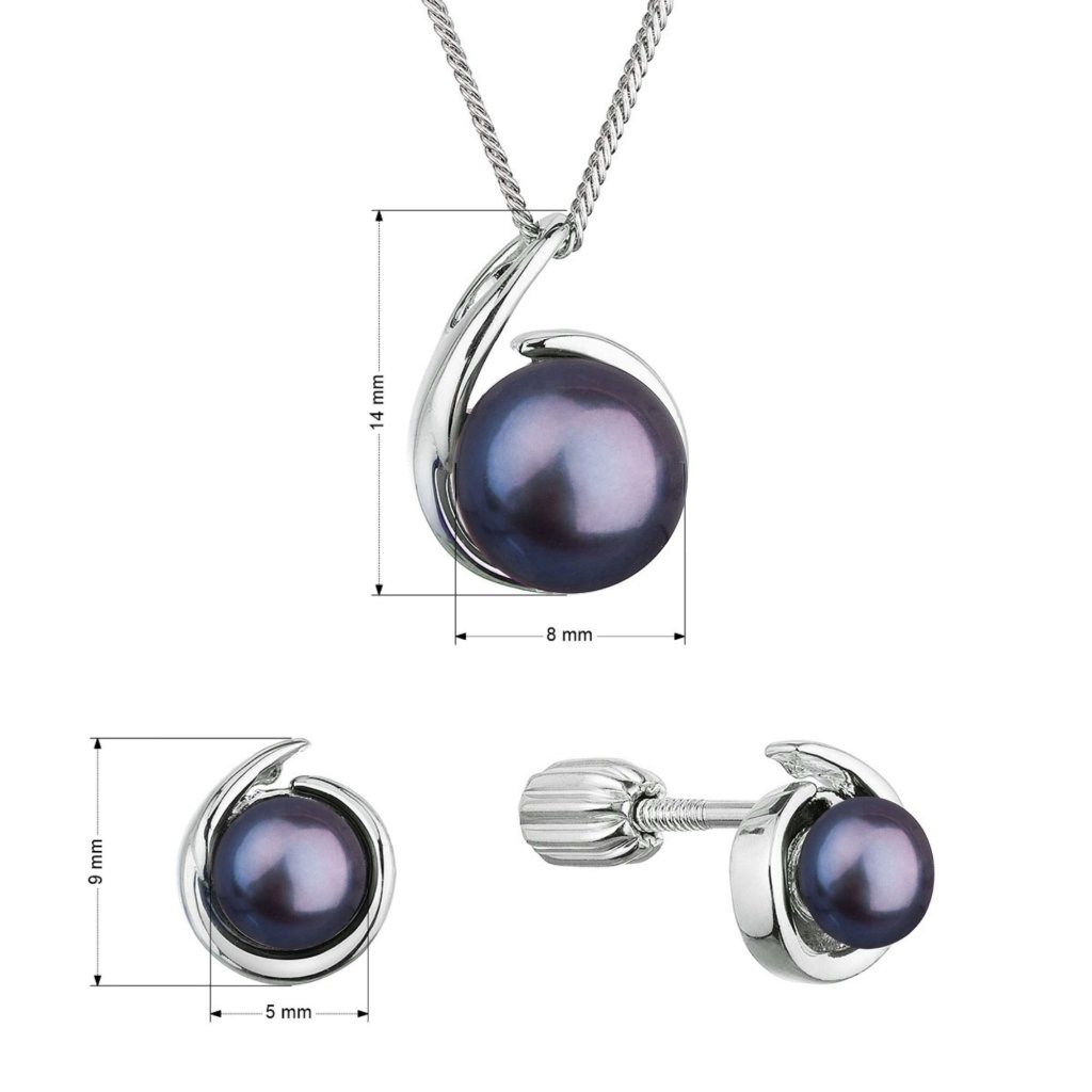 Súprava z tmavých riečnych perál obsahuje slušivé náušnice a prívesok na striebornej retiazke . Peacock sladkovodné perly, ktorými sú šperky zdobené, majú veľmi vysoký lesk, pretože spadajú do kategórie kvality AAA . Farba perál peacock je meniaca sa z tmavo modrého až fialového odtieňa do zeleného až zlatého. Je ťažké túto farbu perličiek presne definovať, preto je nazvaná podľa páva, vždy iná, podľa uhla pohľadu a dopadu svetla .