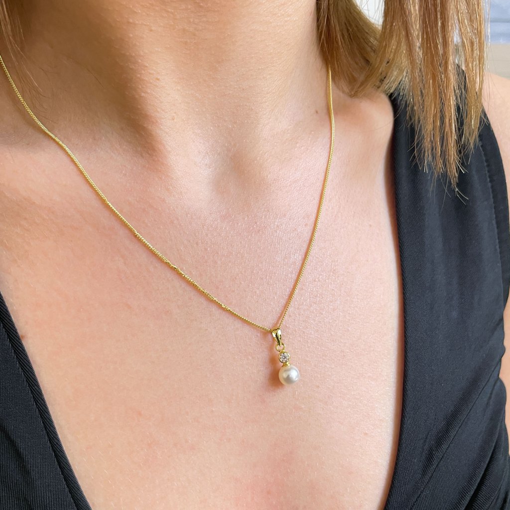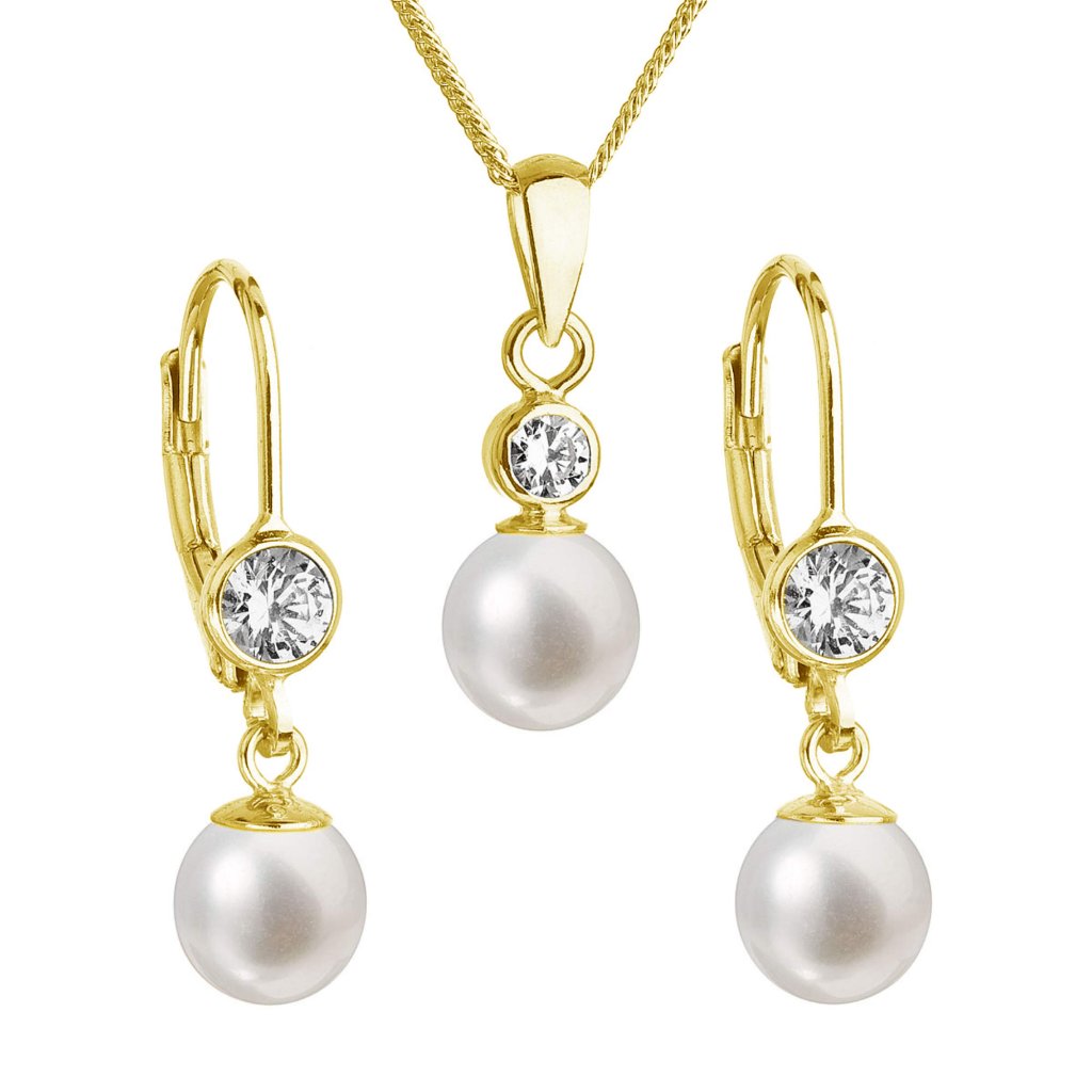 Súprava šperkov obsahuje 25 mm dlhé visiace náušnice ak tomu v rovnakom dizajne aj prívesok na pozlátenej retiazke . Striebro, ktoré sme na výrobu šperkov použili, má rýdzosť 925/1000. Šperky z tejto súpravy sú zdobené pravou riečnou perlou kvality AA a veľkým priezračným zirkónom, ktorý šperkom dodáva výnimočný lesk. Do šperkov nie je pridaný žiadny nikel, a tak ich bez obáv môžu nosiť aj alergici. Zapínanie náušníc je na klapku.