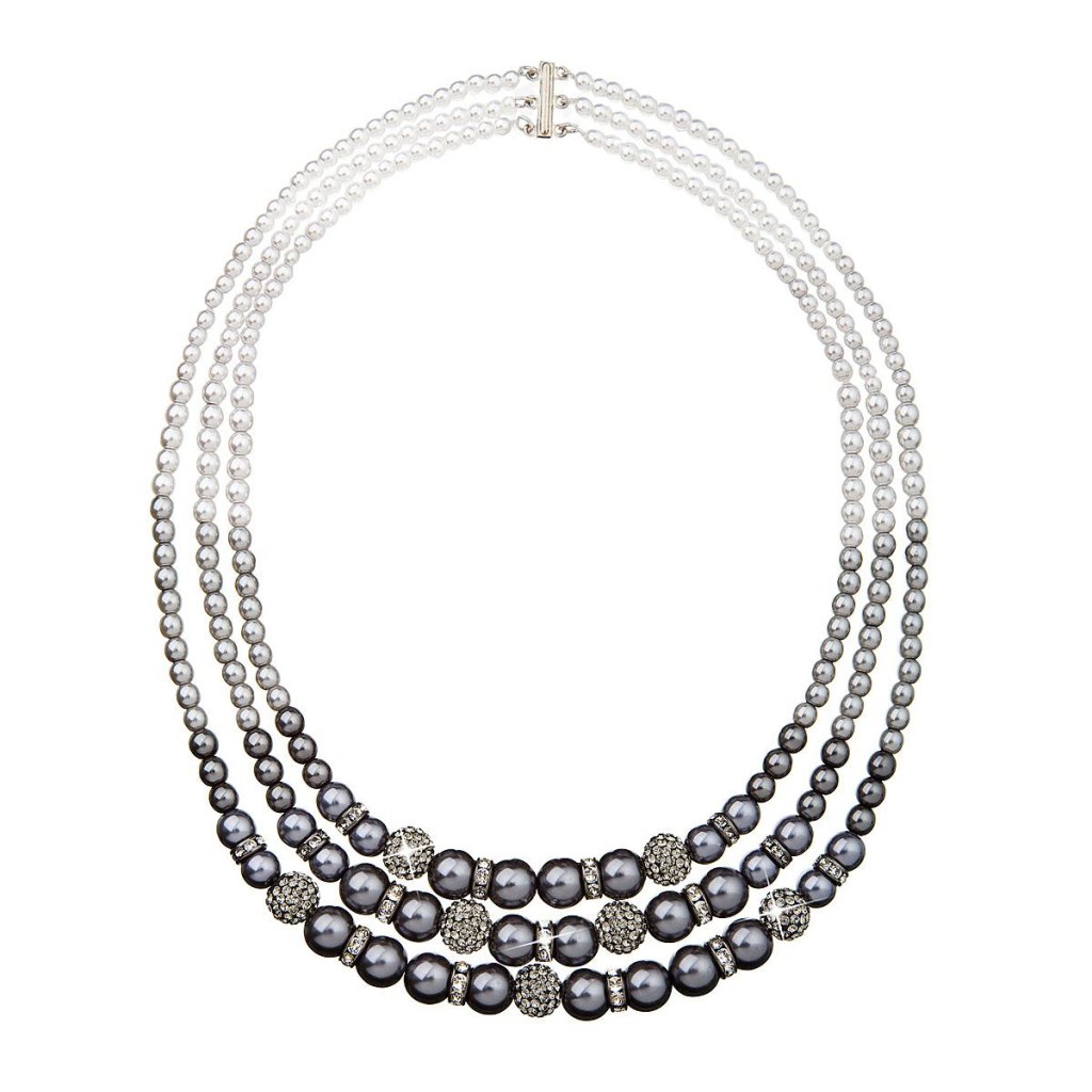Trojitý perlový náhrdelník 32010.3 v dĺžke 45 cm je zložený z 3 radov rôzne veľkých šedých a bielych syntetických perál, medzi ktoré sú navlečené rhuteniové rondelky vysadené Swarovski kryštáliky. Kryštály sú v bielej farbe. Na výsuvné zapínanie náhrdelníka bolo použité striebro rýdzosti 925/1000 , ktoré prešlo úpravou ródiom. Ródium striebro ochráni proti sčernaniu, zožltnutiu i poškriabaniu. Náhrdelník je vhodný aj pre alergikov, neobsahuje totiž nikel.